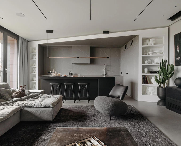 Ten penthouse zaprojektowany przez Karola Cieplińskiego z pracowni CXA zajmuje całą kondygnację nowego budynku i powstał z połączenia dwóch niezależnych mieszkań w jedną, 150-metrową przestrzeń. Projekt nie polegał jednak wyłącznie na scaleniu funkcji – jest raczej próbą nadania zastanej strukturze nowej logiki.