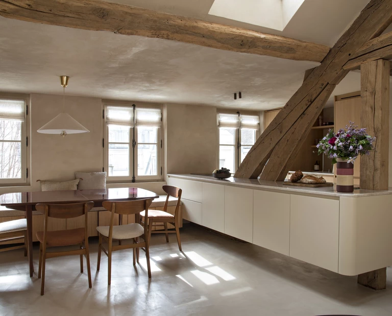 To wnętrze ma w sobie coś z przytulnego domku na wsi – matowe tynki, drewniane belki i mnóstwo naturalnych materiałów. A jednak to centrum Paryża, zaledwie kilka minut od bulwaru Saint-Germain. W dawnych kwaterach służbowych, na ostatnim piętrze kamienicy, projektanci z pracowni Maison A&G stworzyli nostalgiczne mieszkanie dla młodej pary.