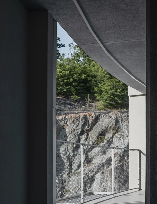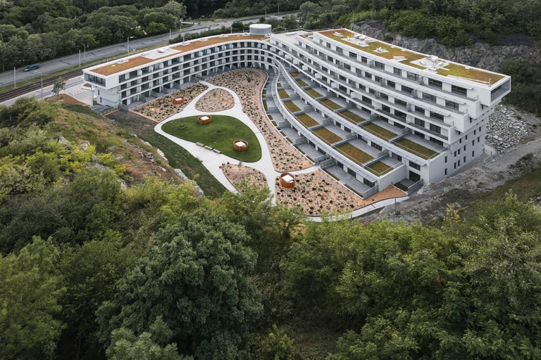 Budynek został dopasowany do terenu dawnego kamieniołomu. Jego frontowa część pełni rolę bariery akustycznej od strony ulicy, by następnie płynnie przejść w część dziedzińcową, odwzorowującą układ stromych zboczy i tarasów skalnych ścian. Naturalne odcienie tynków, mleczne szkło elewacji, łagodnie zakrzywione linie zestawione z ostrymi przełamaniami oraz bujna zieleń – wszystko to tworzy spójny dialog z otoczeniem.