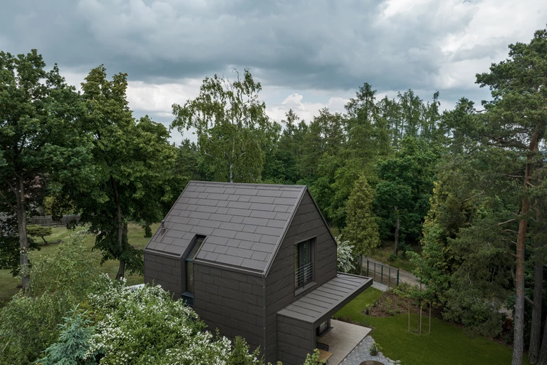 Finalnie domek zdobią ciemnoszare płytki aluminiowe, których wzór budzi skojarzenie z szyszką. Te same płytki wykorzystano w roli dachówek. Aluminiowa powierzchnia wyróżnia się trwałością i łatwością konserwacji.