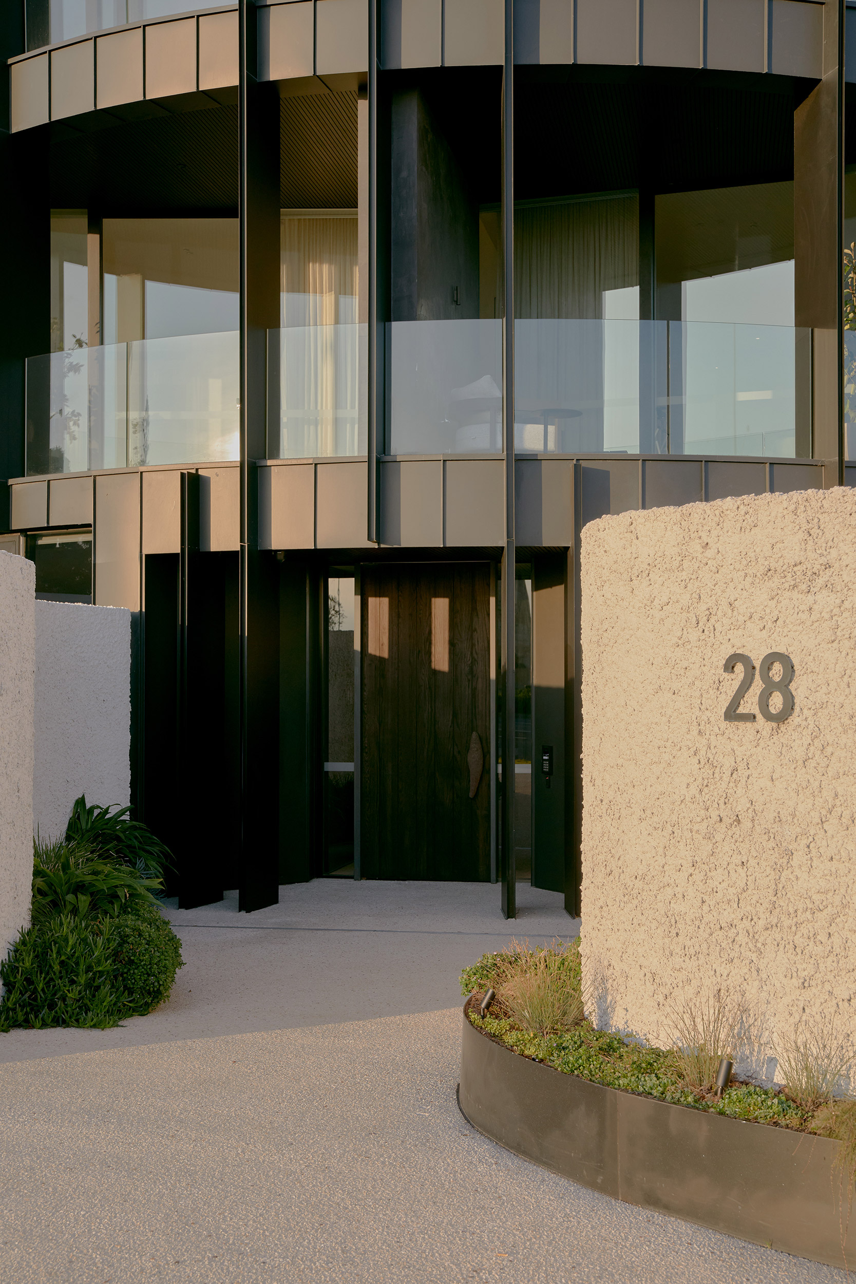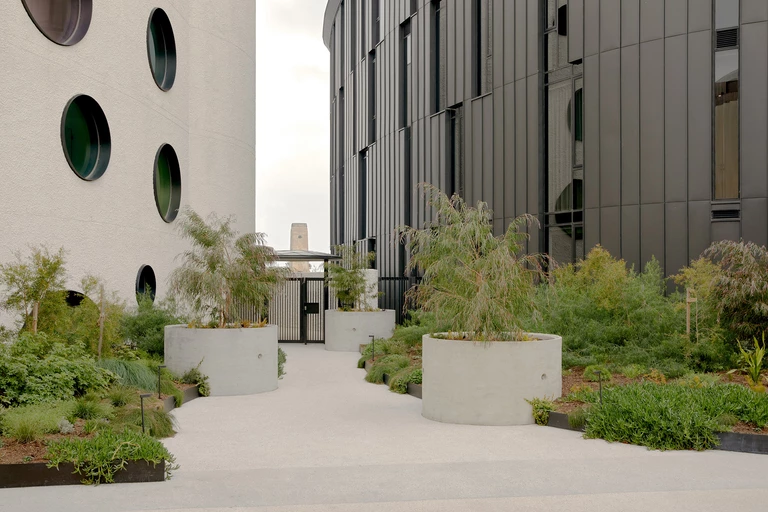 Zamiast wypełniać działkę zwartą zabudową, architekci Wood Marsh zaprojektowali serię rzeźbiarskich pawilonów, rozmieszczonych wśród rozległej zieleni. Ponad połowę terenu przeznaczono na krajobrazowy ogród zaprojektowany przez – zielony kręgosłup łączący domy szeregowe w tylnej części działki z apartamentowcami od strony ulicy. Taka kompozycja nie tylko wprowadza przestrzeń i światło, lecz także wzmacnia powiązania widokowe z otoczeniem i osiami wizualnymi nawiązuje do memoriału Green Point Cenotaph, położonego w sąsiedztwie.