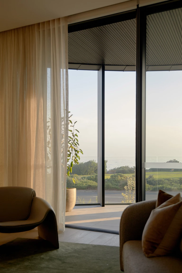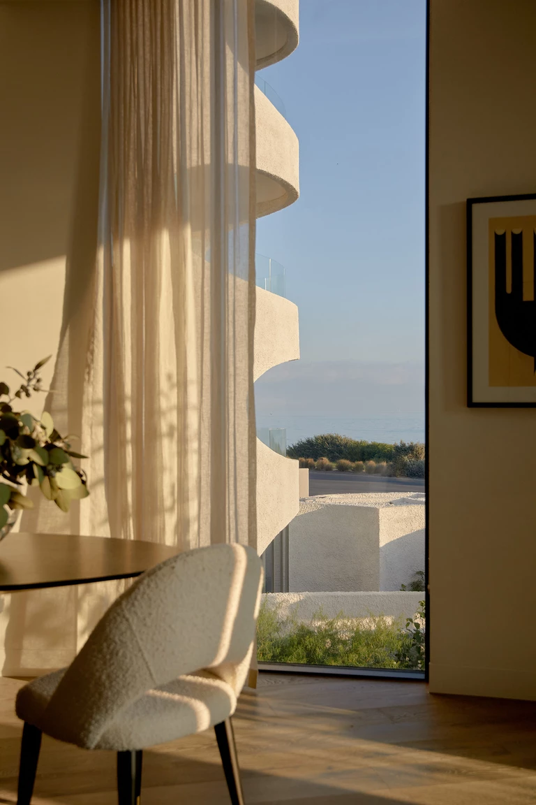 Od strony plaży budynki apartamentowe wpisują się w istniejącą linię zabudowy i stopniowo stają się coraz to niższe, dzięki czemu projekt zachowuje skalę i rytm lokalnej tkanki miejskiej, zdominowanej przez niskie domy jednorodzinne i kameralne rezydencje.
