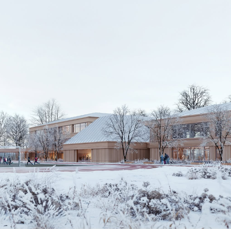 Głównym elementem koncepcji jest boisko z bieżnią, wokół którego zogniskowany został cały zespół budynków. Umieszczenie sportowych obiektów w centrum kampusu sugeruje, że to właśnie wokół ruchu i aktywności skoncentrowane będą integrujące mieszkańców działania. Szkoła stanie się w ten sposób bardziej dostępna i zyska dodatkową, wzmacniającą więzi funkcjonalność.