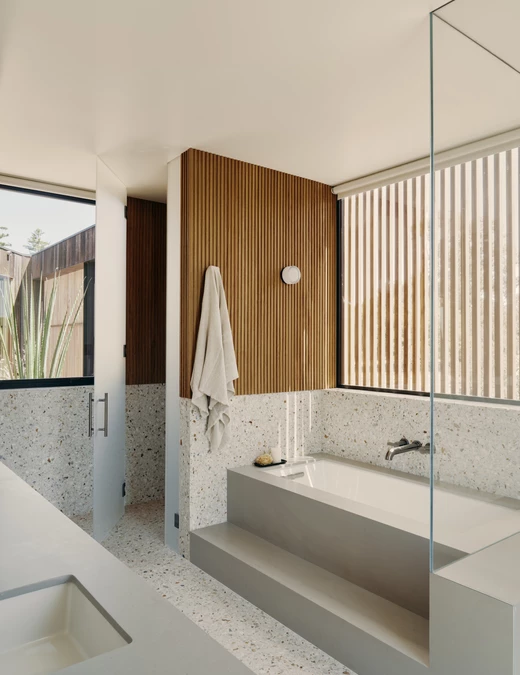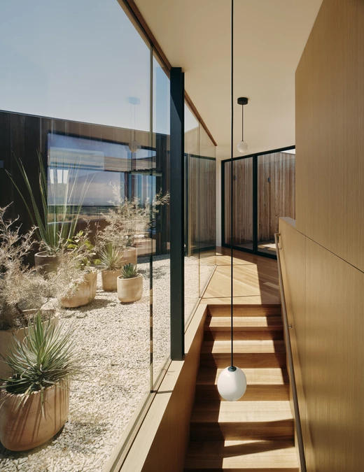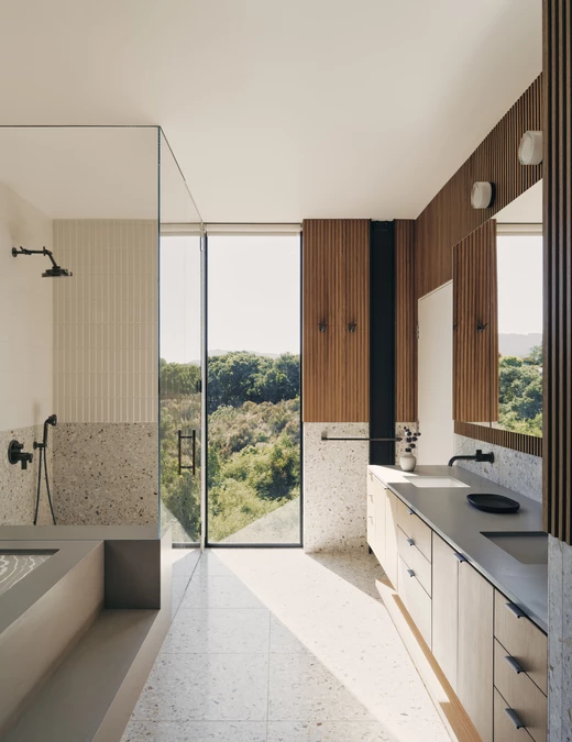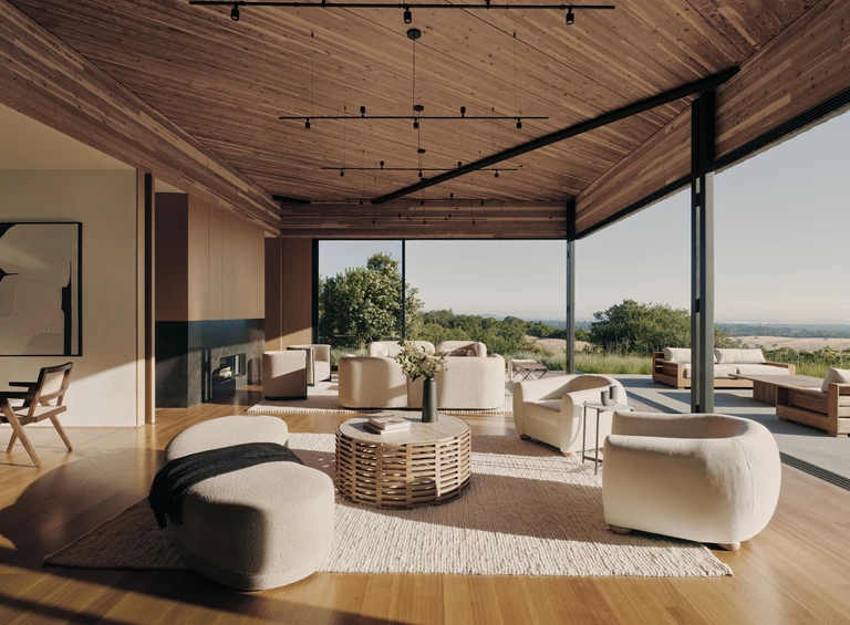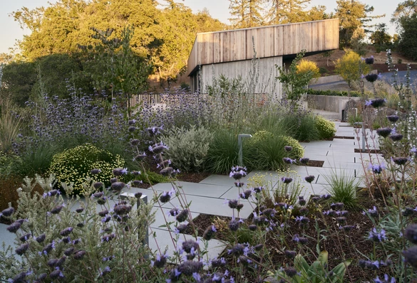 Istotnym elementem projektu jest także krajobraz. Zespół wprowadził roślinność rodzimą dla regionu, która z czasem ma naturalnie wtopić się w otoczenie i reagować na zmieniające się pory roku. Dzięki temu architektura i ogród rozwijają się razem, a dom stopniowo staje się częścią szerszego ekosystemu wzgórz Portola Valley.