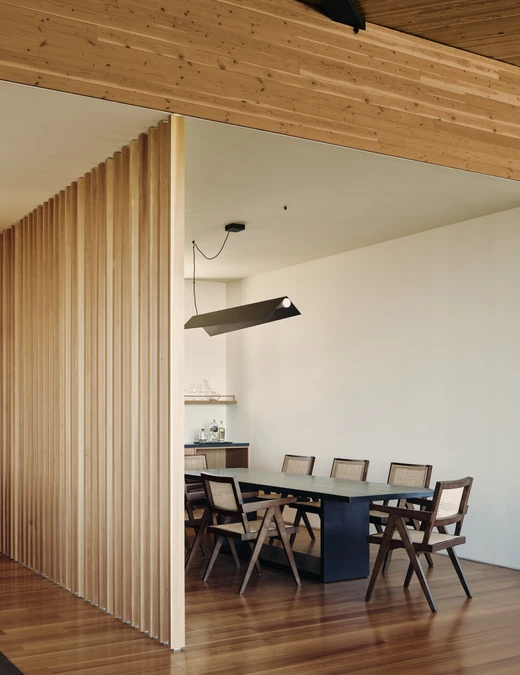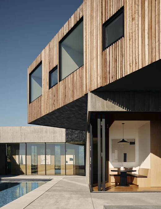 Wyższe kondygnacje obłożone zostały deskami z odzysku. Drewno pochodzi z sekwoi powalonych przez pożary i osuwiska w okolicznych lasach. W miarę starzenia się materiał nabiera srebrzystej patyny, wzmacniając wizualny związek budynku z otaczającym krajobrazem. Architekci wykorzystali również fragmenty okładziny z poprzedniego domu stojącego na działce. Choć konstrukcja była zbyt zniszczona, by ją zachować w całości, część elementów udało się ponownie włączyć w nową architekturę. Recykling materiałów stał się więc jednym z głównych wątków projektu.