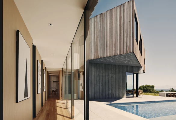 We wnętrzu domu uwagę przyciąga duży salon, który dzięki systemowi przesuwnych okien niemal całkowicie otwiera się na dolinę. Architekci zestawili tę ekspozycję z przestrzeniami o kameralnym charakterze – dziedzińcem, tarasem na dachu i basenem. Każda z nich tworzy własny, bardziej intymny mikroświat w obrębie większej kompozycji.