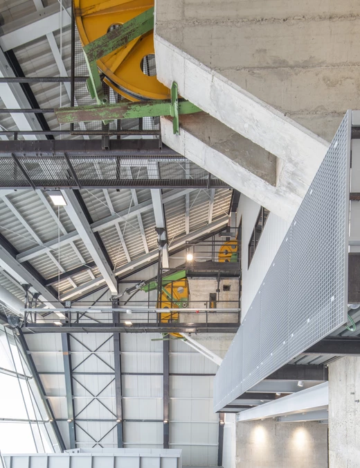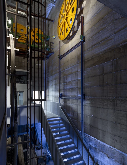 Odwiedzający przestrzeń prowadzeni są przez kluczowe części dawnego obiektu technicznego. Wejście poprowadzone zostało przez otwór wydrążony w zboczu, dalej trasa przechodzi pod nowym dachem wpasowanym w krajobraz i sprowadza odwiedzających do holu, gdzie w miejscu imponującego 17-metrowego szybu powstała klatka schodowa.
