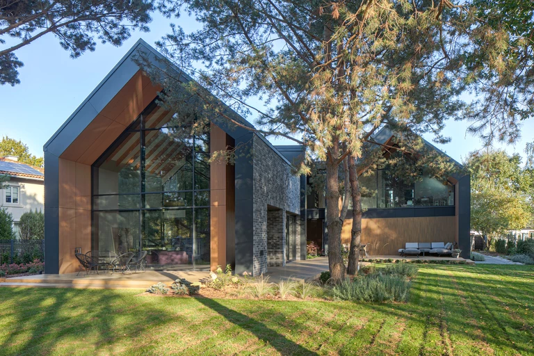 Ten dom dla czteroosobowej rodziny znajduje się pod Warszawą, w miejscowości Komorów. Stanowi współczesną odsłonę tradycyjnej mazowieckiej architektury. Składa się z dwóch stodół, którym architektka Katarzyna Starzyk z pracowni A.P.A. Katarzyna Starzyk nadała bardzo współczesny charakter. Jednocześnie stworzyła projekt, który harmonijnie współgra z naturą.