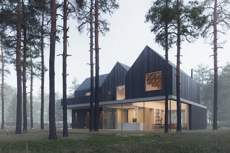 Działka otoczona jest z trzech stron z lasem. Duże, rozsuwane przeszklenia w parterze pozwalają połączyć jadalnię i salon z otaczającą zielenią, a przez dodatkowe okna w szczycie budynku zaglądają korony okolicznych drzew. Wysoki na dwie kondygnacje salon został zlokalizowany pod drewnianym dachem z odkrytą więźbą, która również od strony wnętrz niejednoznacznie nawiązuje do charakterystycznych „świdermajerowych” zdobień.