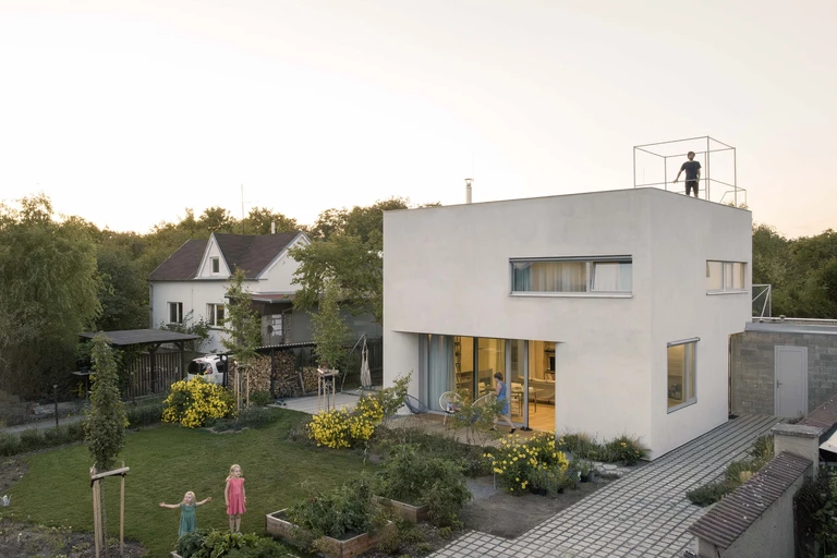 Zaglądamy do jednej z dzielnic domów jednorodzinnych w czeskiej Pradze. Układ urbanistyczny jest tu gęsty, dostępne pod zabudowę tereny nie są więc imponujących rozmiarów. Dodatkowym utrudnieniem jest gęsta sieć urządzeń sieci satelitarnej rozlokowana w okolicy. Młoda rodzina z dwójką dzieci, która wybrała tę lokalizację na miejsce pod nowy dom, chciała pomimo skromnego metrażu działki zachować jak najwięcej ogrodu. Projekt powierzyła praskiej pracowni Papundekl Architekti.