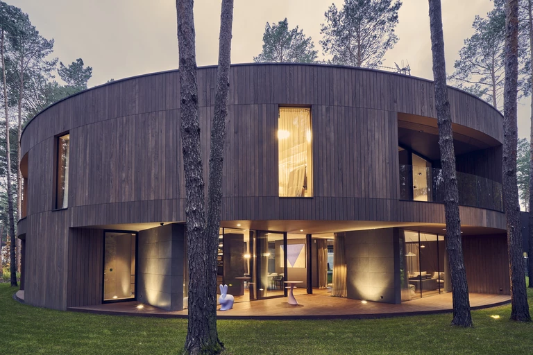 Dom został wykonany w konstrukcji żelbetowej. Obłożono go panelami z pochodzącego z Afryki drzewa Okume. Egzotyczne drewno idealnie wpasowało budynek w leśne otoczenie.