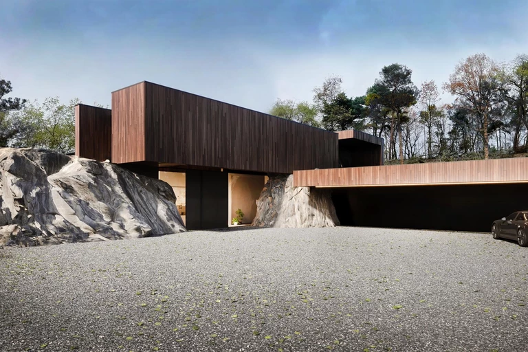 Skała między budynkami została potraktowana przez architekta jak materiał będący kluczowym elementem do stworzenia całego projektu. Dziś ten dom wygląda tak, jakby od początku te skały miały tam być – w tym konkretnym miejscu. Daje to efekt wielu brył poprzedzielanych wielkimi głazami.