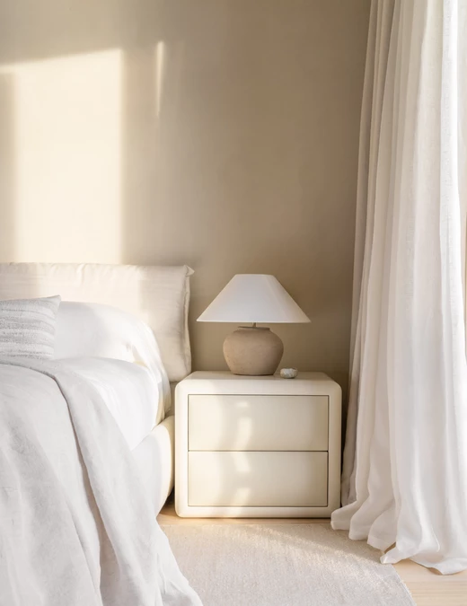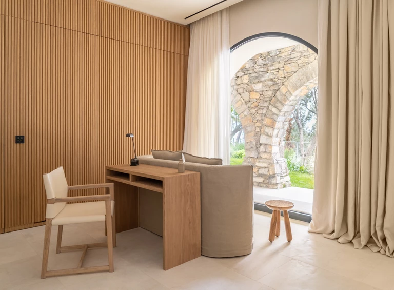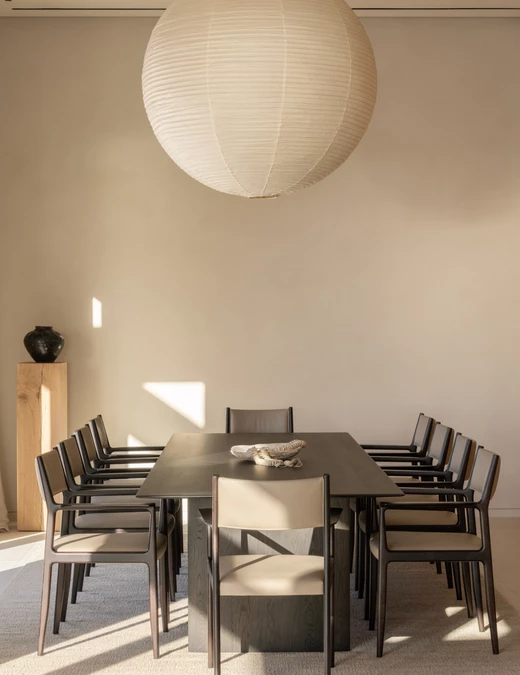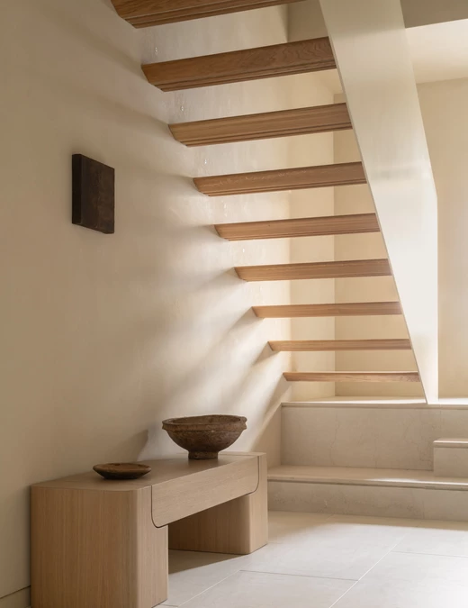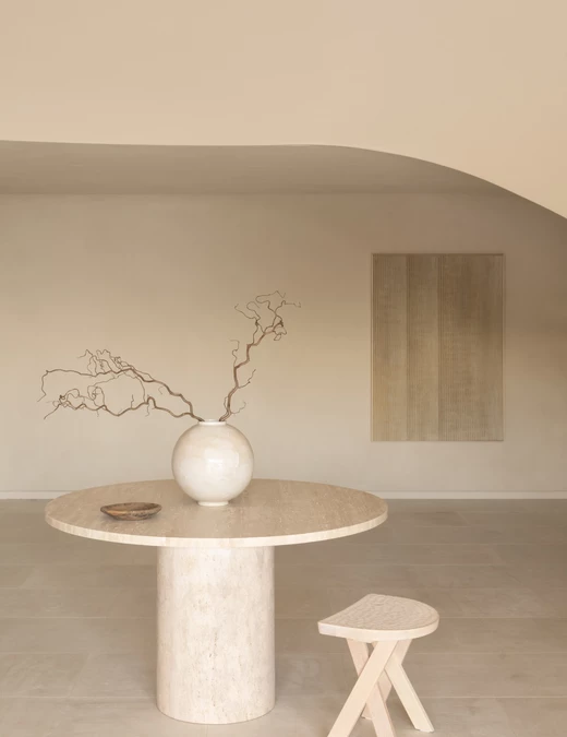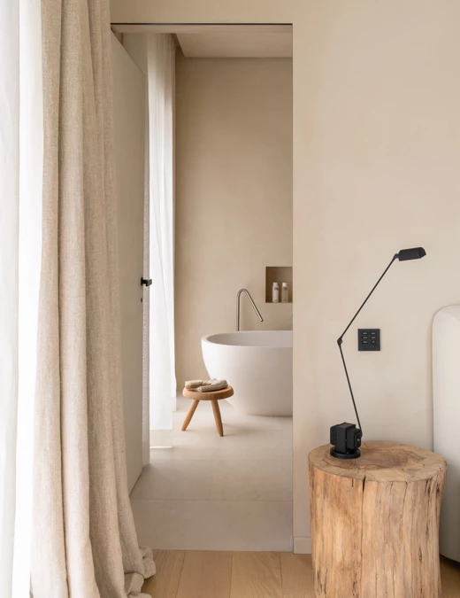 Za wnętrza odpowiada studio.skey. Projektanci konsekwentnie zastosowali marmur Botticino na podłogach, kontynuując materiał obecny także na zewnątrz, a ściany wykończyli wapnem. Zabudowy, które powstały z litego dębu, nie dość, że pięknie wyglądają, to sprytnie ukrywają instalacje, jednocześnie wpływając na akustykę pomieszczeń. Projektanci zestawili je z materiałami o wyraźnej fakturze – lnem, skórą i drewnem oraz z wybranymi meblami współczesnymi i vintage.