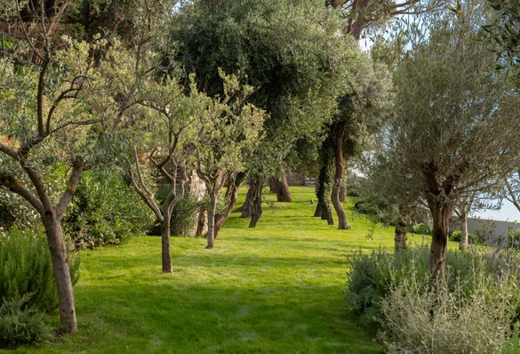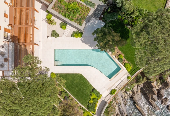 We współpracy z zespołem caarpa, odpowiedzialnym za architekturę krajobrazu, rozwinęli układ tarasów i ścieżek, które prowadzą przez działkę zgodnie z naturalnym spadkiem terenu. Kamienne nawierzchnie i marmur Botticino pojawiają się zarówno przy budynku, jak i w jego wnętrzu, dzięki czemu przejście między domem a ogrodem jest jednolite. W dalszych częściach działki nawierzchnie przechodzą w lokalny, surowiej łupany kamień.