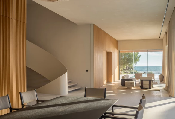 Z willi widać zarówno fragmenty wyżej położonej działki, jak i linię morza. Projektanci świadomie ograniczyli paletę barw do neutralnych, stonowanych odcieni, które nie konkurują z otoczeniem. Jasne wnętrza budują spokojne tło dla codziennego życia, jednocześnie kierując uwagę na widok za oknem. Morze, zieleń i zmieniające się światło są najważniejszym elementem tej przestrzeni.