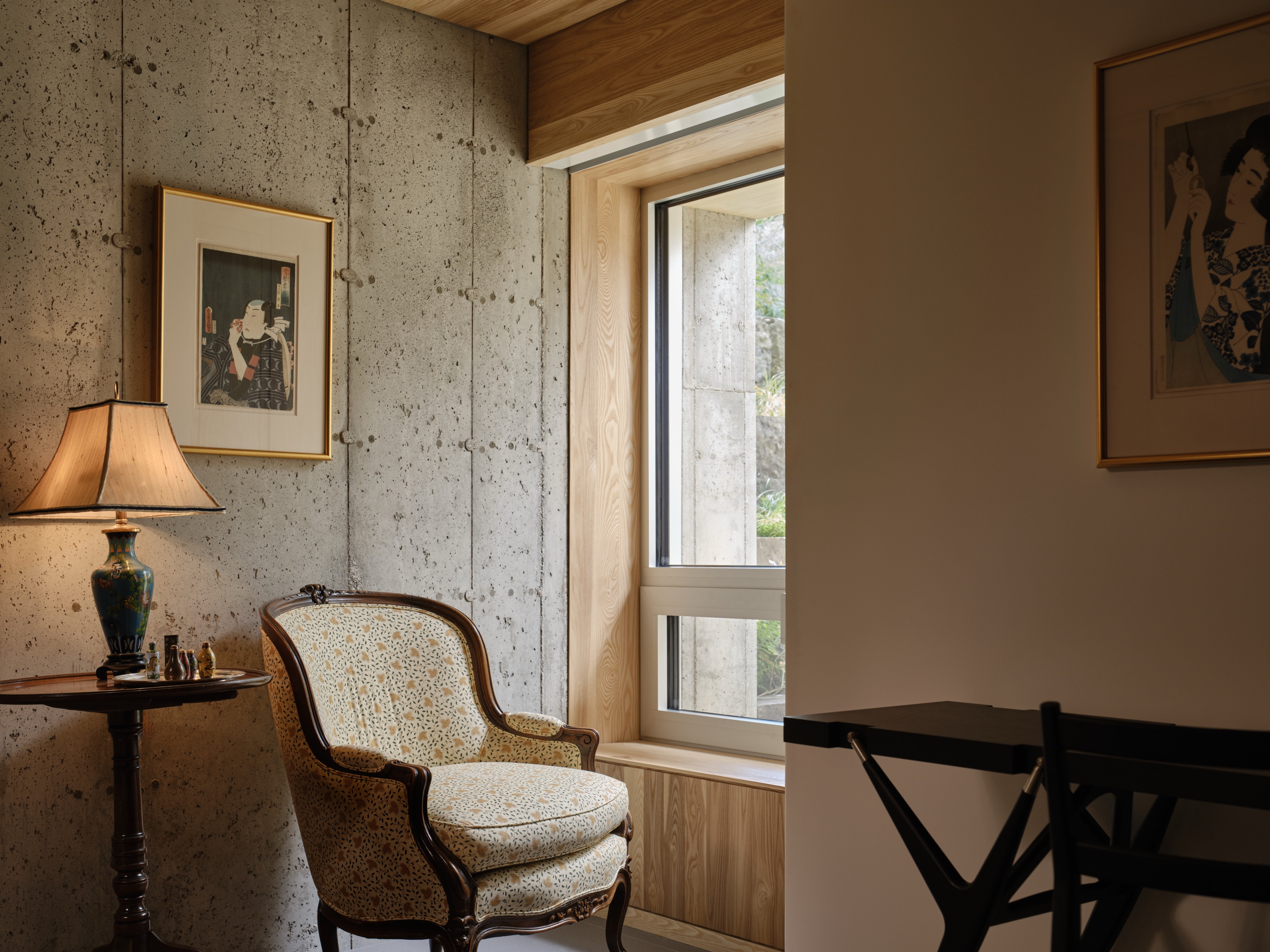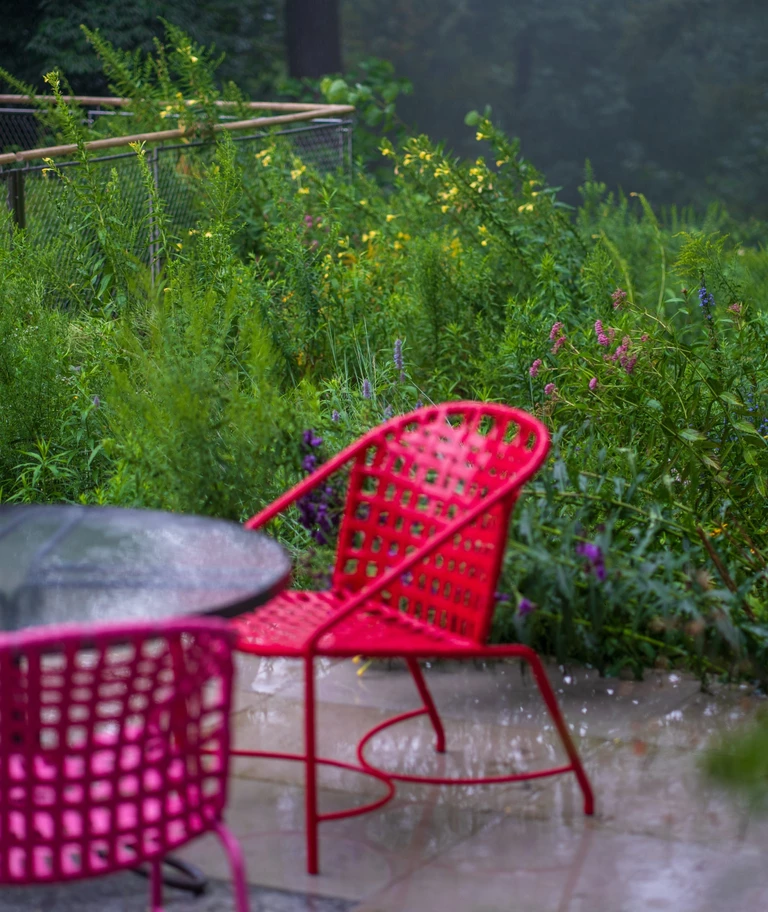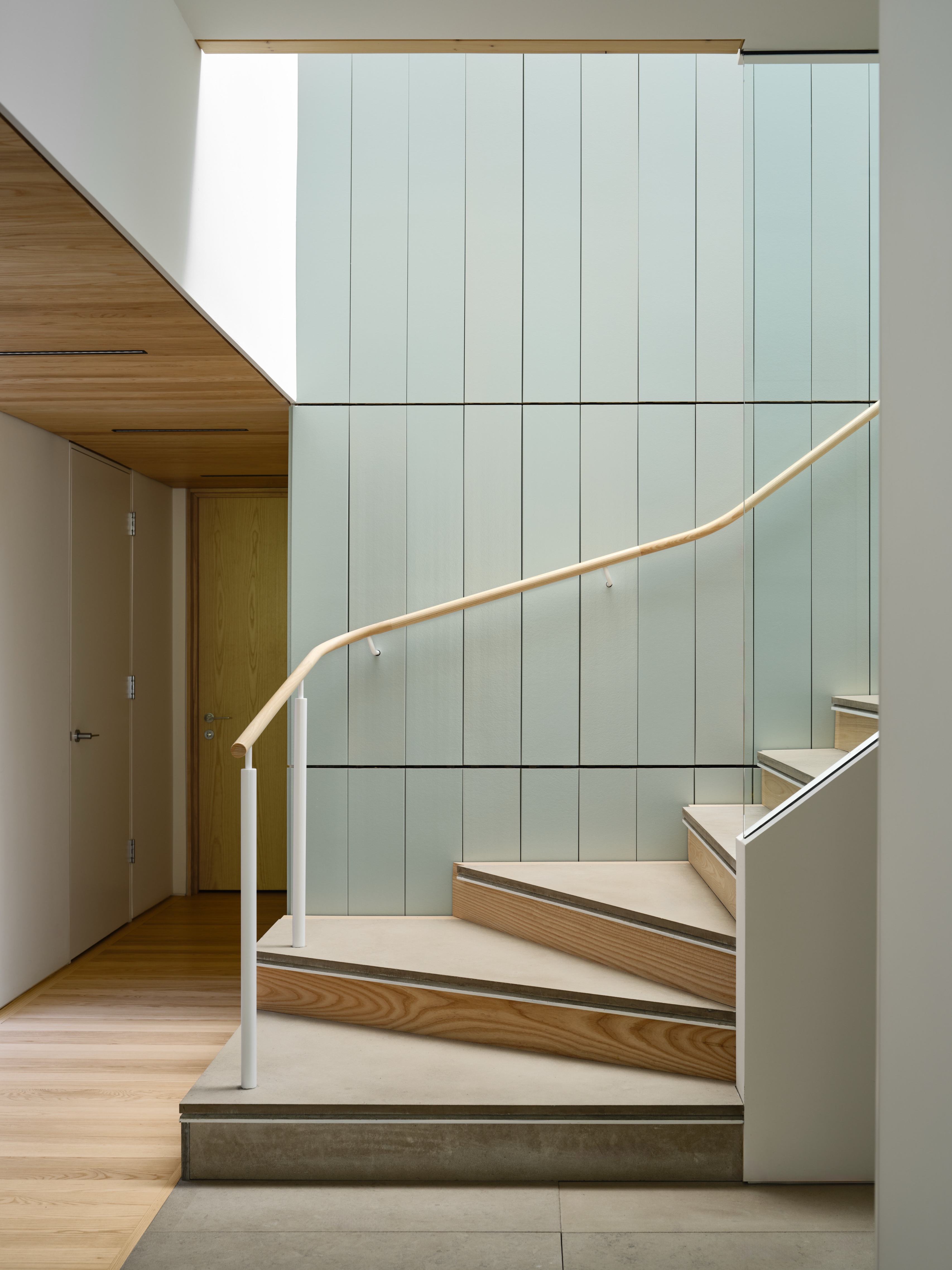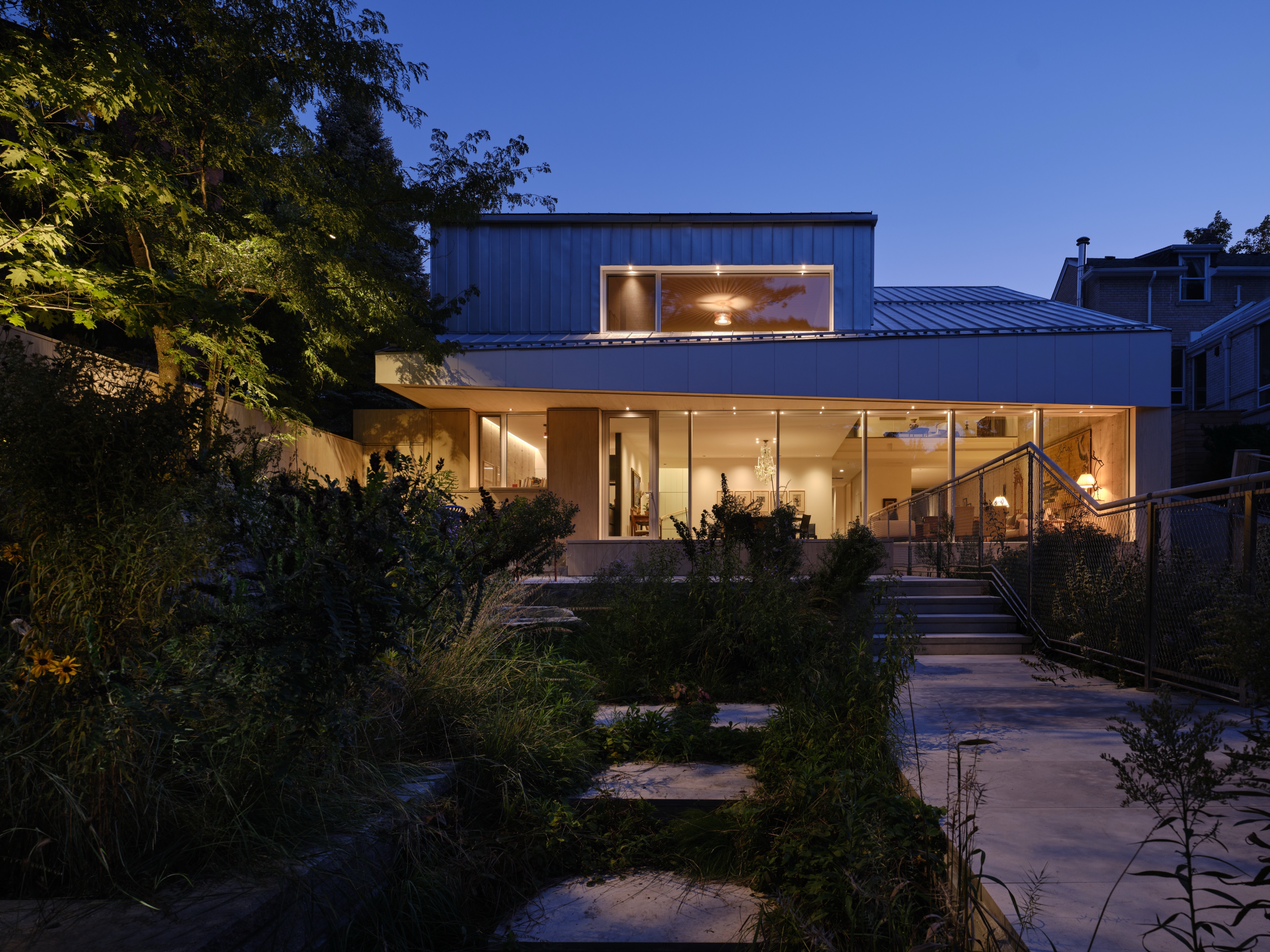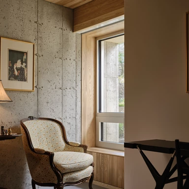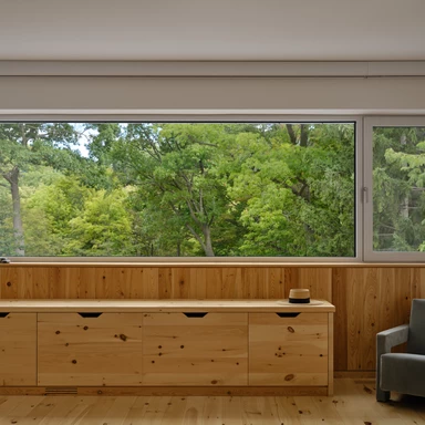 Najbardziej charakterystyczny jest jednak północny front: ciągła, pełnej wysokości ściana szkła, która kadruje widok na zalesiony stok i zmienia się razem z porami roku. Przed przeszkleniem rozciągają się tarasy i półotwarta przestrzeń pośrednia, która pozwala stopniowo zejść w kierunku wąwozu, bez ostrej granicy między płytą tarasu a terenem.