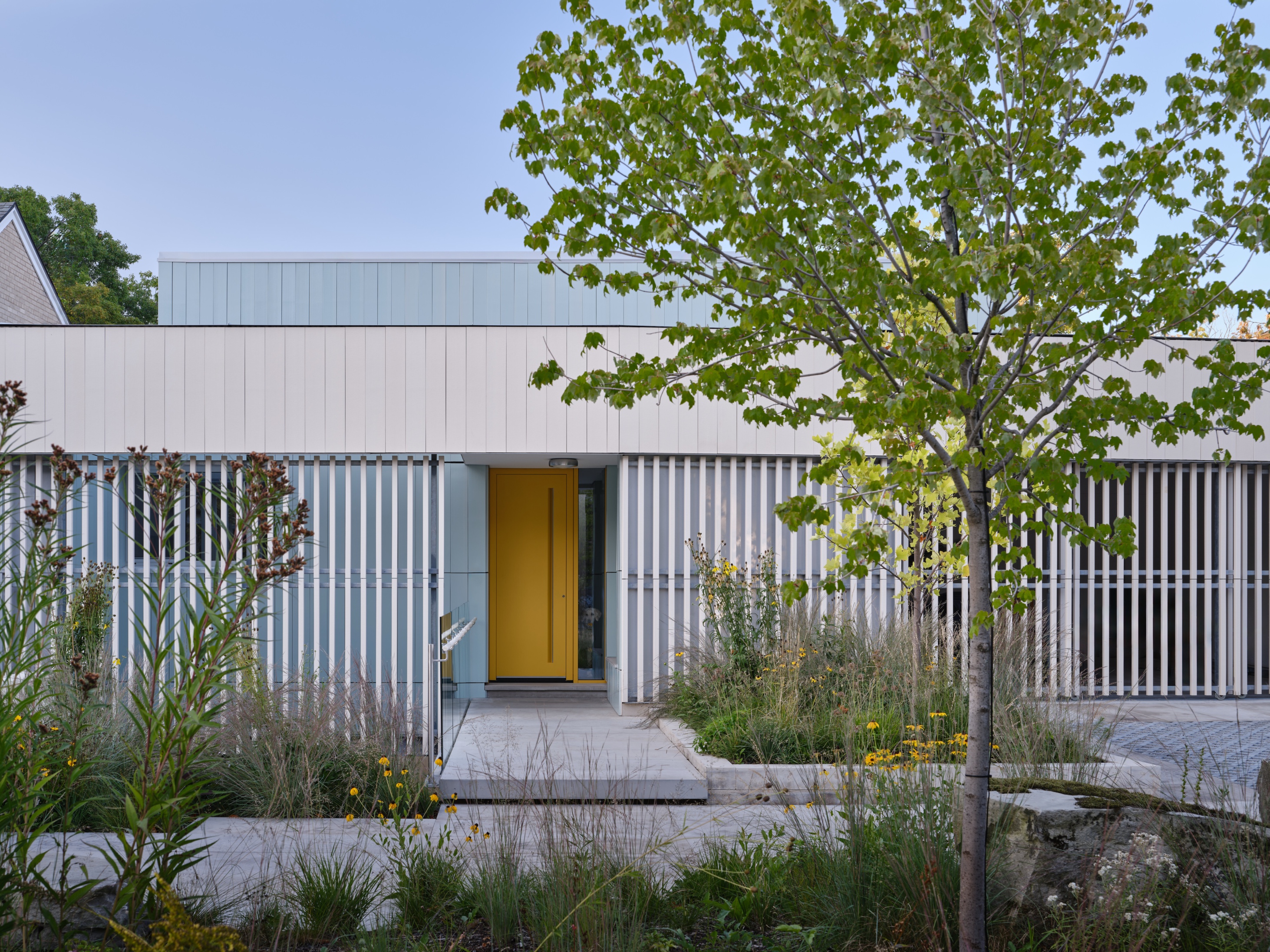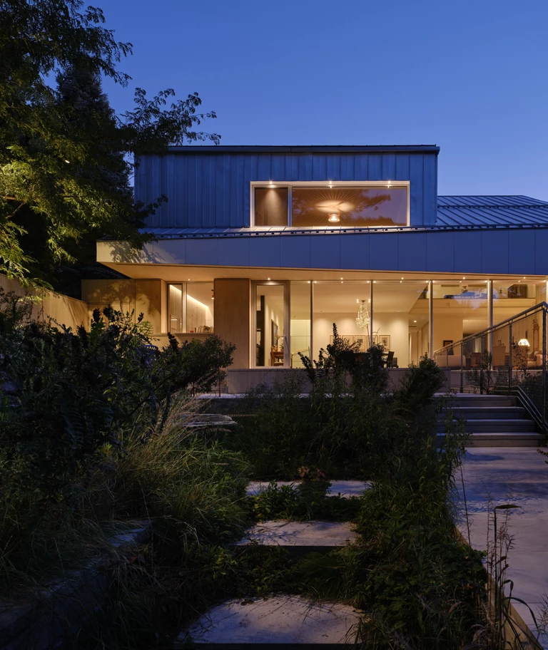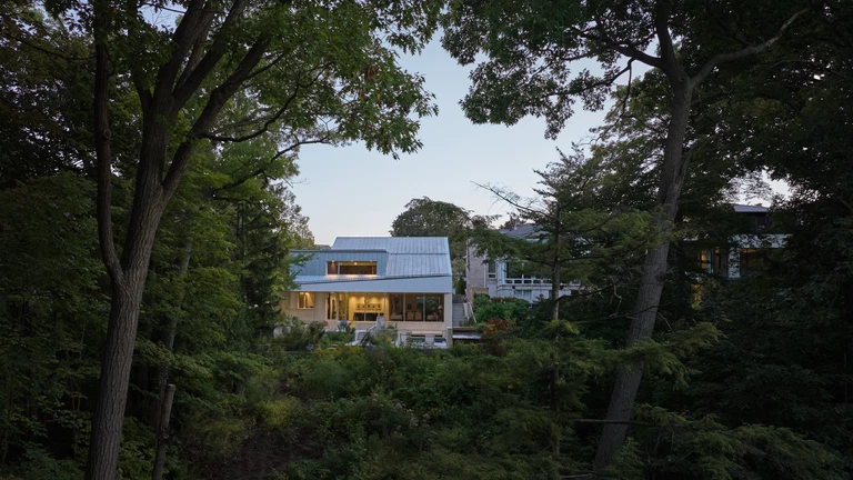 Z ulicy widać przede wszystkim dyskretne elewacje, ale prawdziwa historia tego domu zaczyna się od północnej ściany - przeszklonej tafli, która otwiera wnętrze wprost na dziki stok West Don Ravine w Toronto. To pierwszy w mieście dom z certyfikatem PHIUS Passive House, zaprojektowany przez Poiesis Architecture dla rodziców Gregory’ego Rubina, architekta i założyciela studia. Zamiast spektakularnego gestu wyburzenia i przeprowadzki, rodzina postanowiła zostać w dobrze znanym sąsiedztwie i na tej samej działce zbudować parterowy dom dopasowany do etapu przedemerytalnego i do coraz bardziej nieprzewidywalnego klimatu.