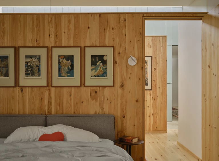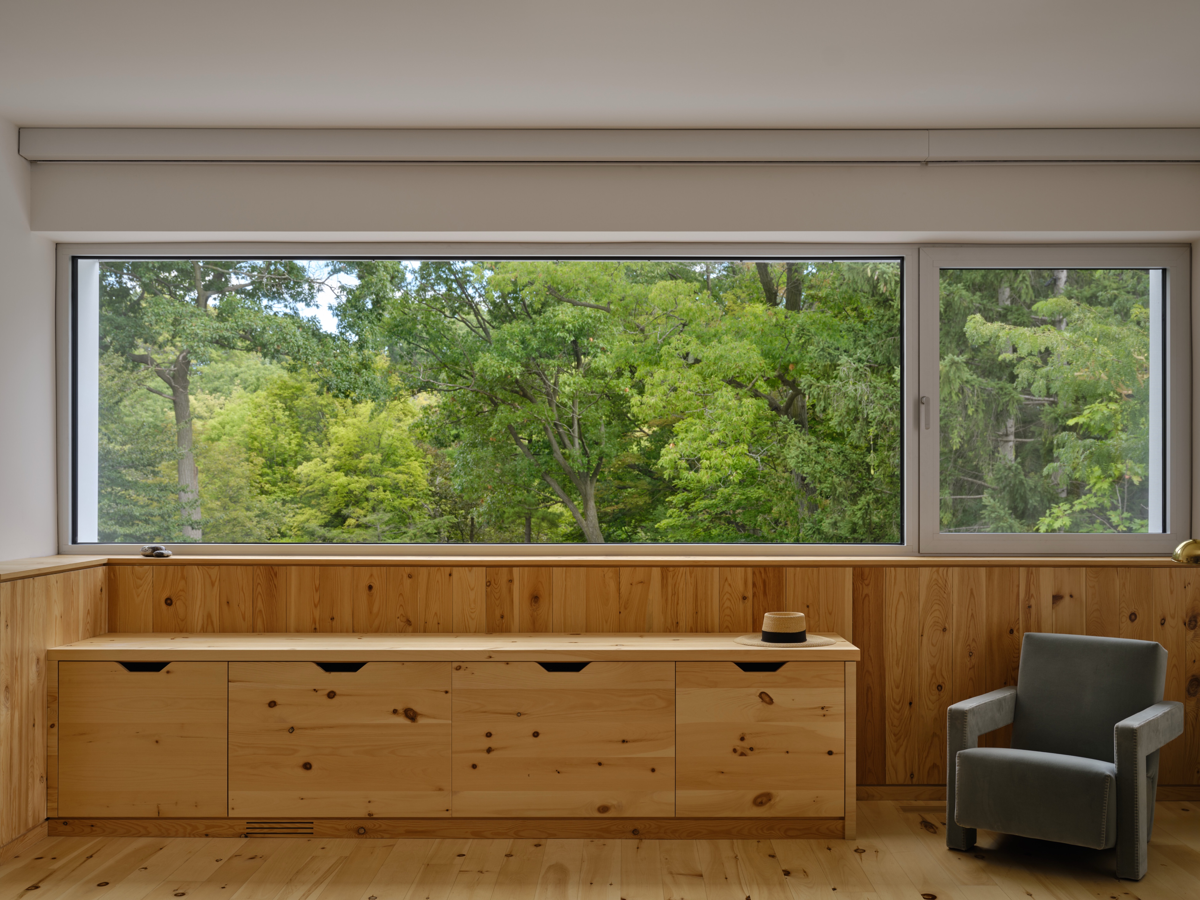 W częściach dziennych pojawia się lokalny wapień, natomiast strefy prywatne wykończono podłogami z jasnego jesionu; w głównej sypialni wprowadzono deski z sosny jack pine i white pine, co wzmacnia wrażenie domku na drzewie zawieszonego nad wąwozem.