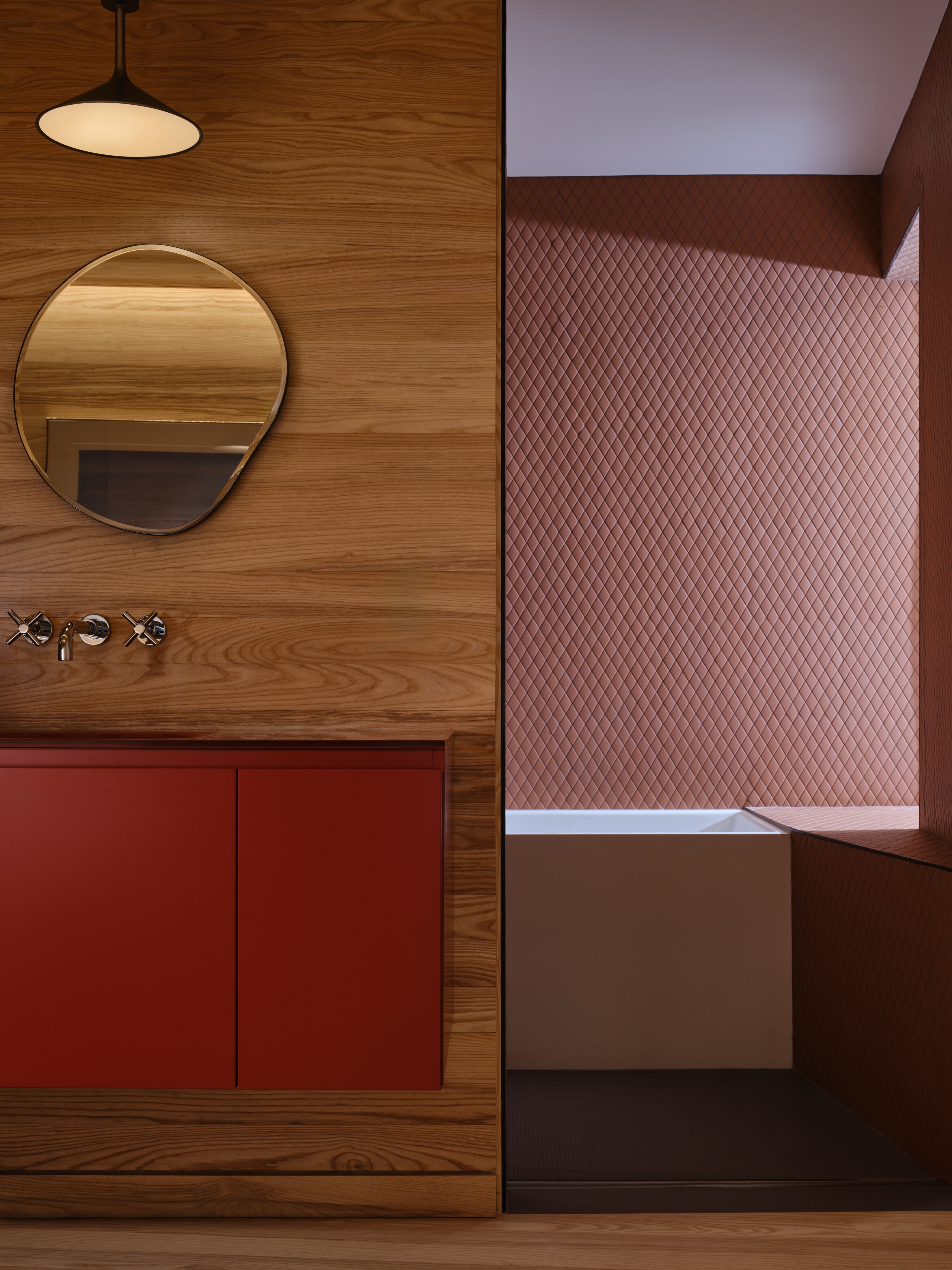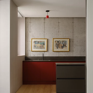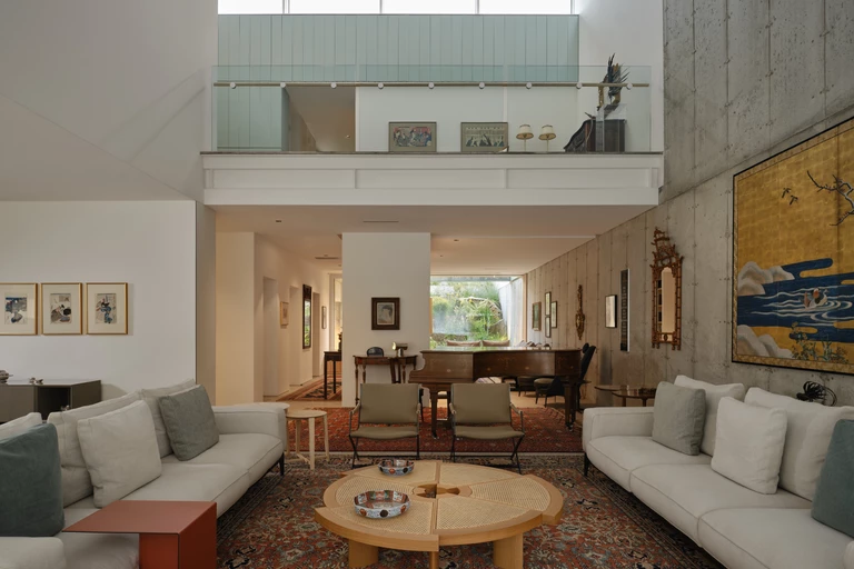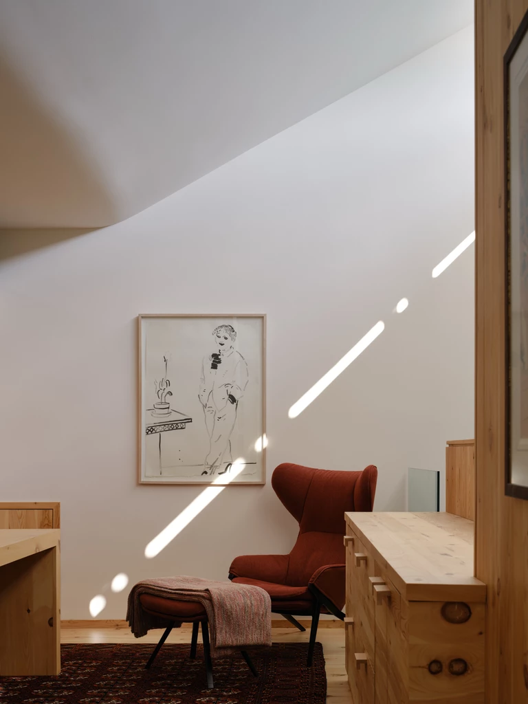 Atresola obłożona terakotowymi panelami dzieli dom na dwa poziomy, a jednocześnie filtruje światło z góry. Po stronie południowej wcięty w bryłę ogród na niższym poziomie wciąga do środka naturalne światło i zieleń, prowadząc je przez wysokie okno w dół, do salonu i kuchni.