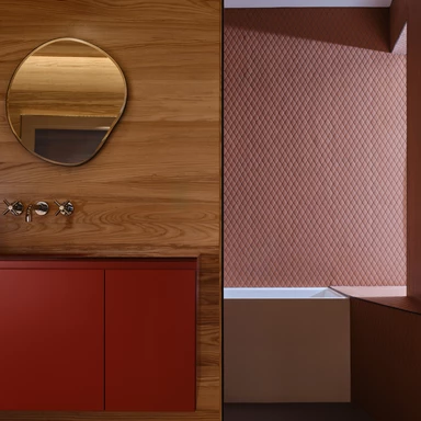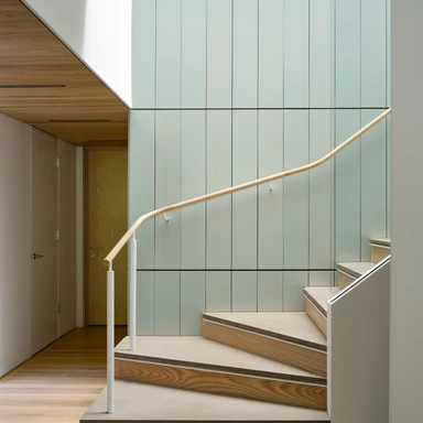 Materiałowo West Don Ravine Passive House balansuje między surowością a wyrafinowaniem: beton i terakota pojawiają się zarówno na zewnątrz, jak i we wnętrzach, spajając dom w jedną, czytelną całość. Prostokątna bryła podzielona jest wewnętrznie na funkcjonalne ćwiartki, co porządkuje przepływ i ułatwia orientację. Naturalne, zgaszone odcienie terakotowych baguette i płytek zestawiono z chłodniejszym tonem betonu i błękitną terakotą, która kadruje wybrane fragmenty fasady.