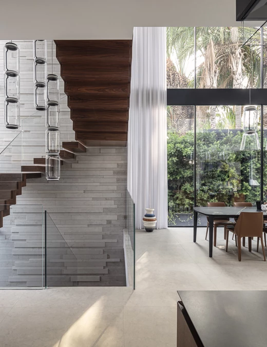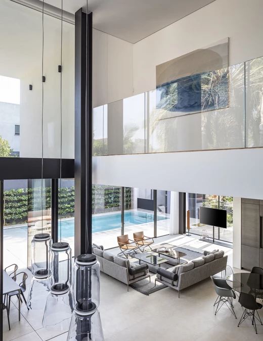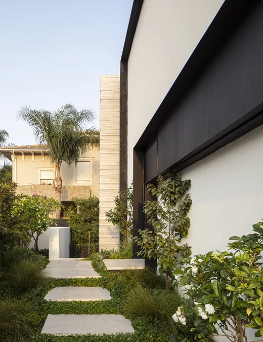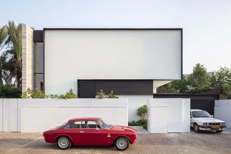 Za projekt tego 500-metrowego domu odpowiada architekt Raz Melamed. Głównym założeniem projektu było zabudowanie fasady frontowej w celu zachowania prywatności mieszkańców, przy zapewnieniu odpowiedniej ilości światła wewnątrz domu. W tym celu ze strony ogrodu z basenem zaprojektowano duże okna.