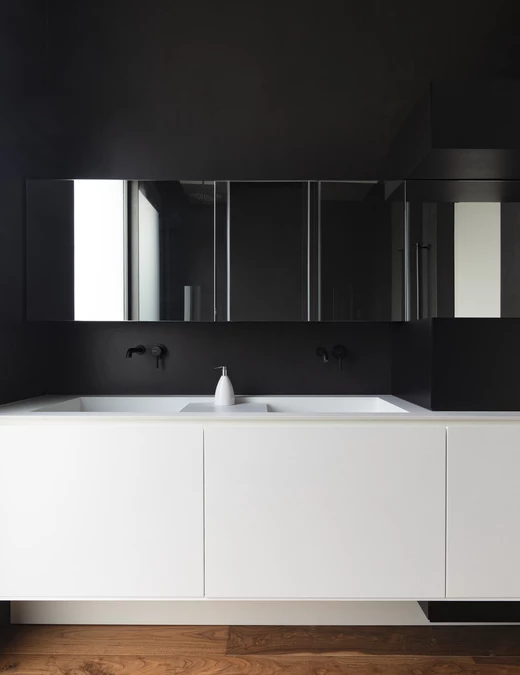 W sypialni głównej znajduje się przestronna szafa wnękowa wykonana z polipropylenu. Przylega do niej przestronna łazienka, która urzeka czarnymi ścianami i interesującą czarno-białą stolarką.