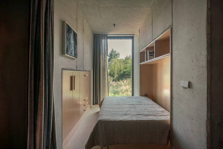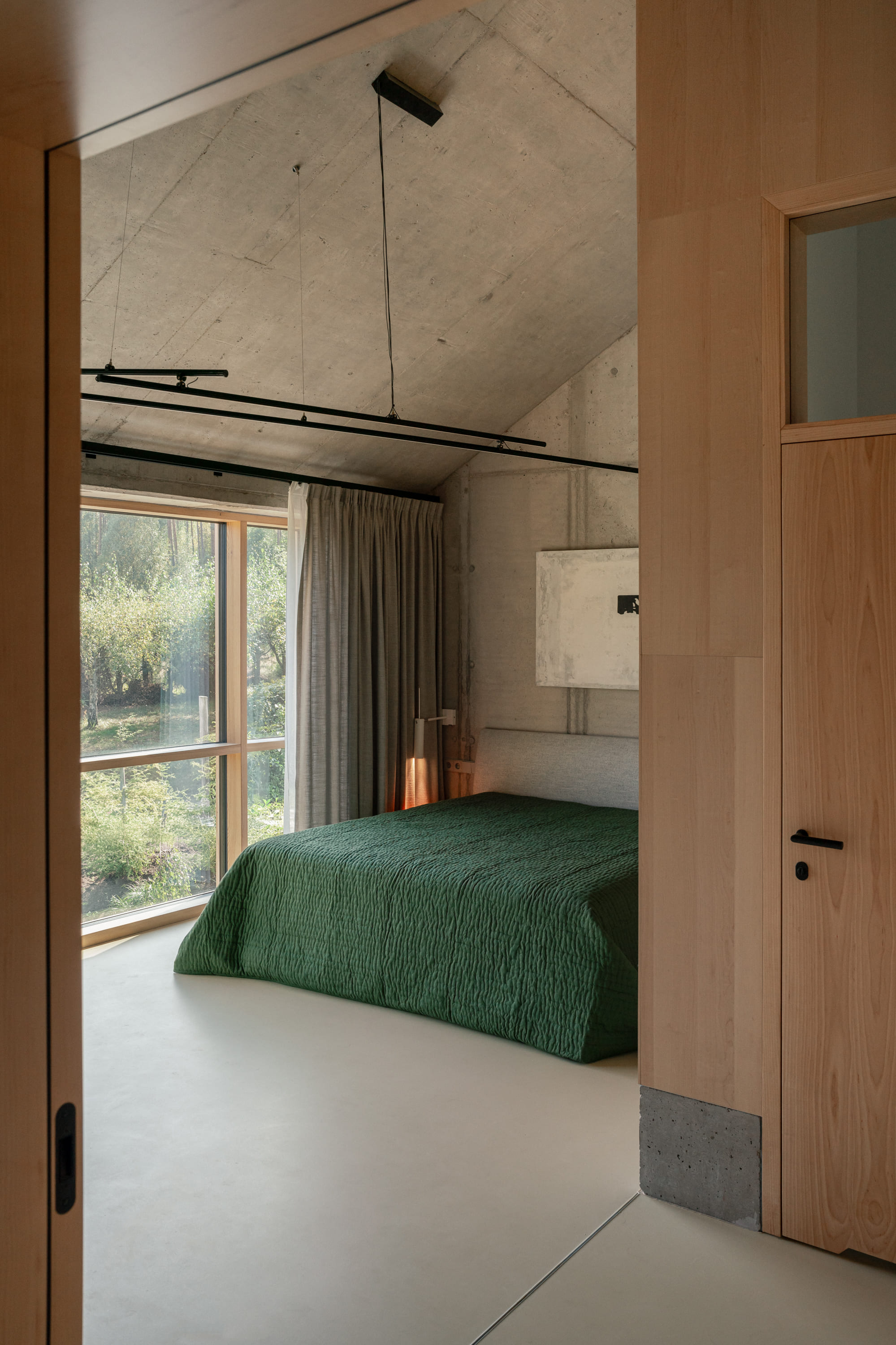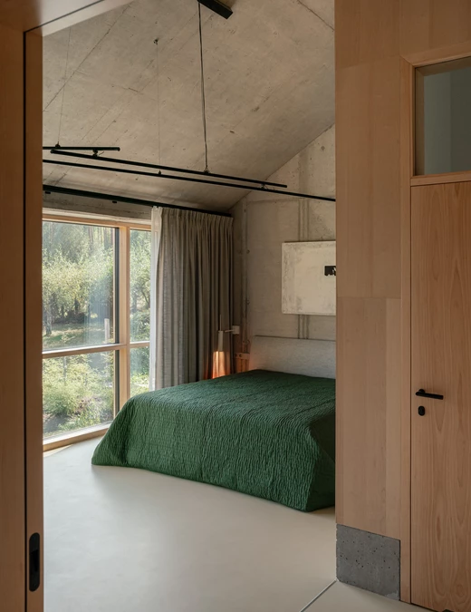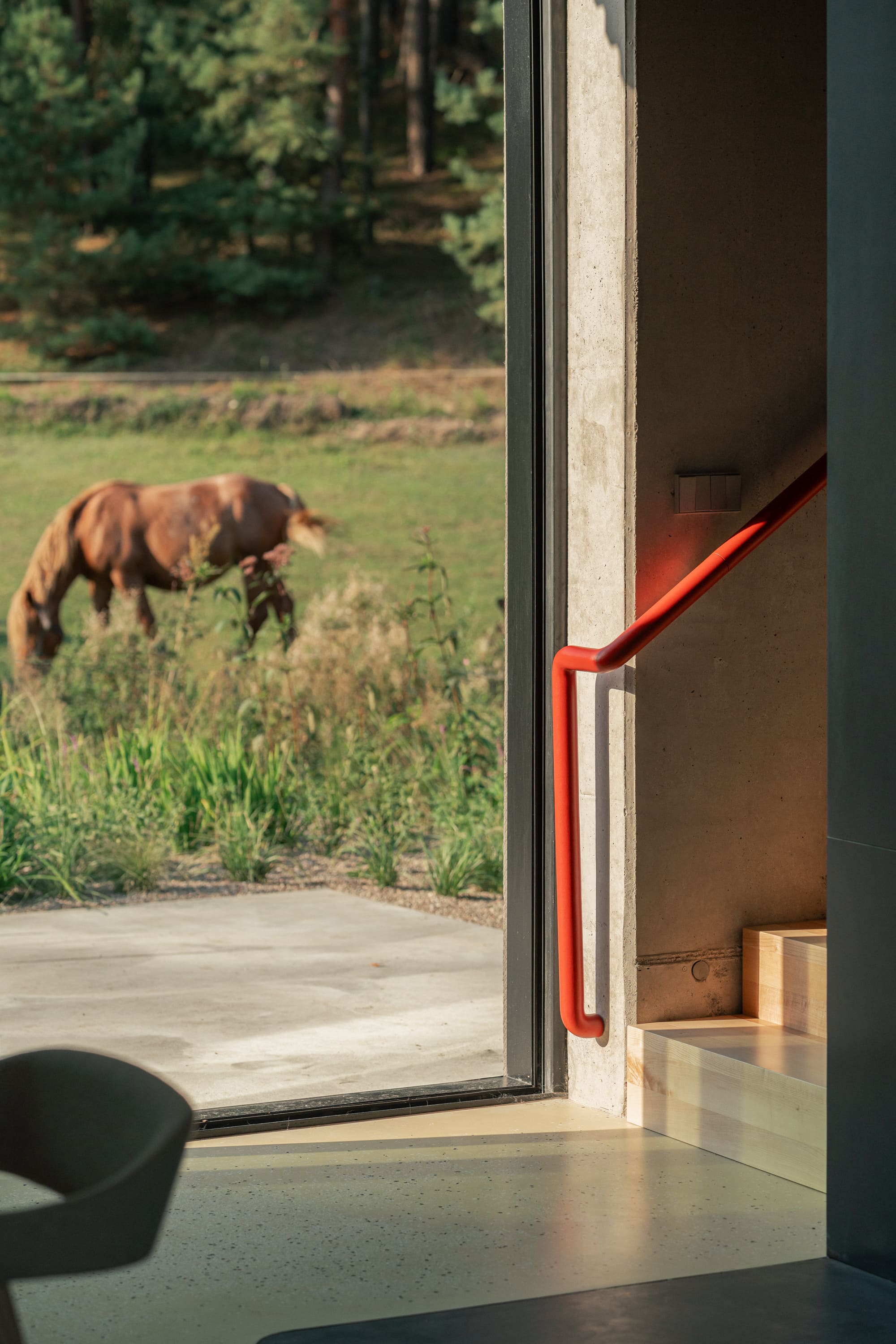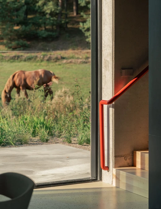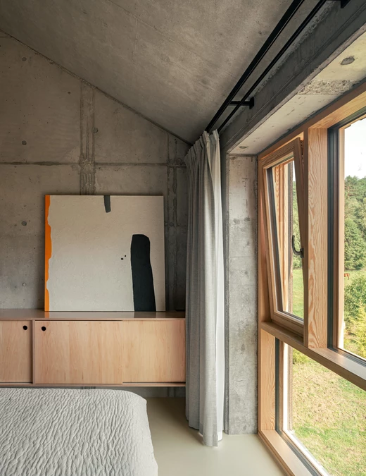 Zróżnicowane otwarcia w elewacji podkreślają relację domu z otoczeniem. W części sypialnej pojawiają się mniejsze, rytmicznie rozmieszczone okna, nawiązujące do tradycyjnej architektury regionu.