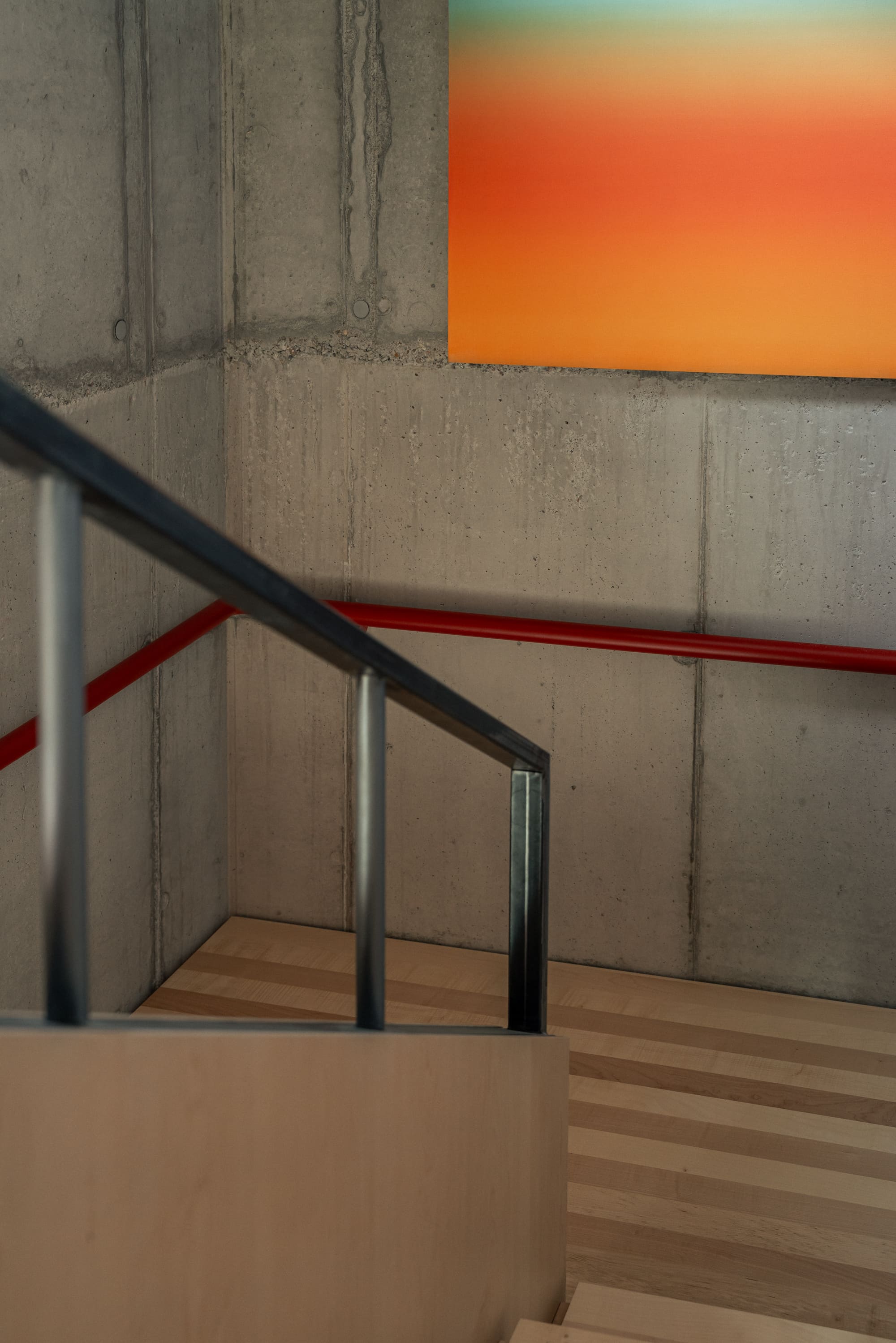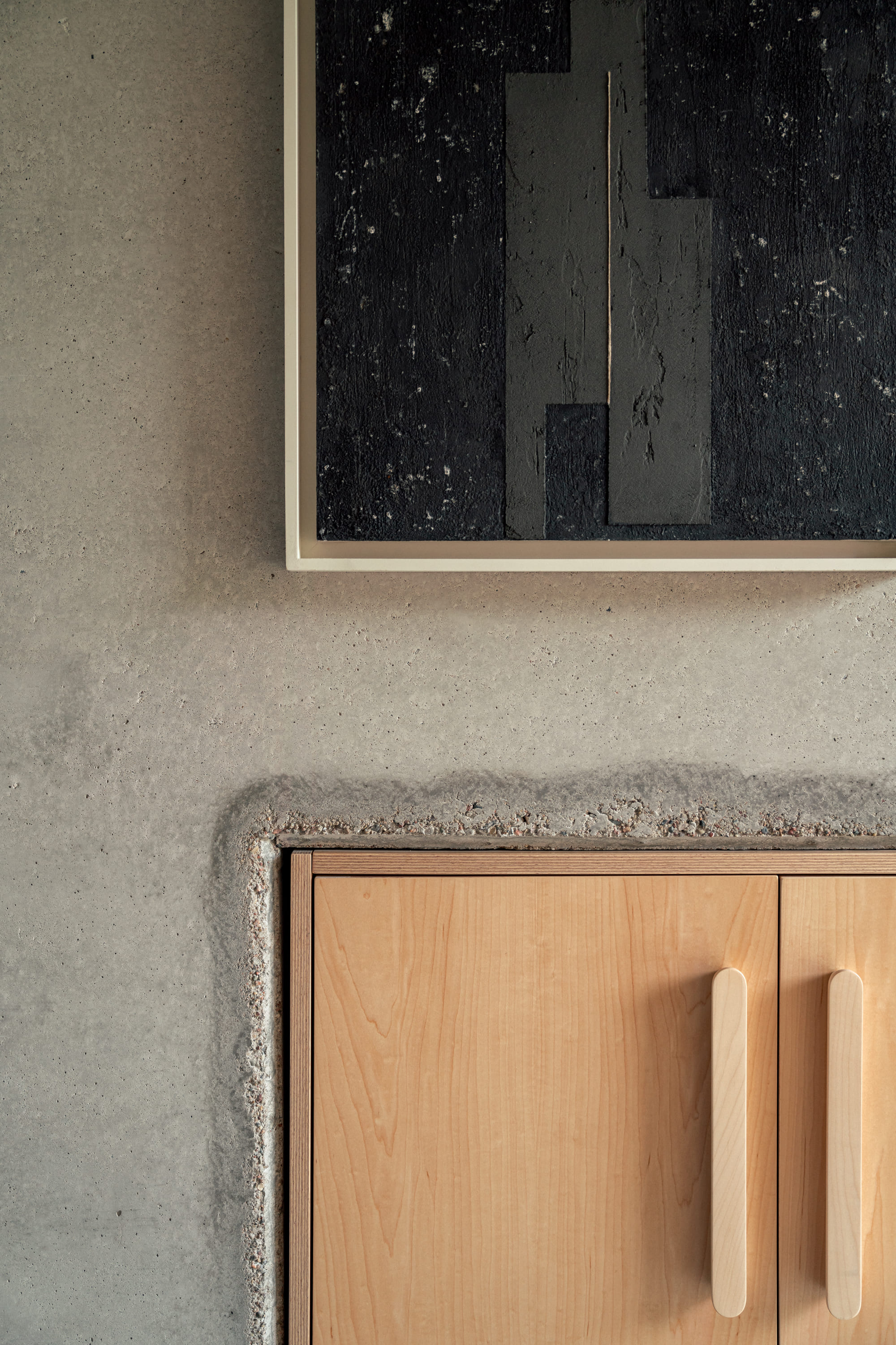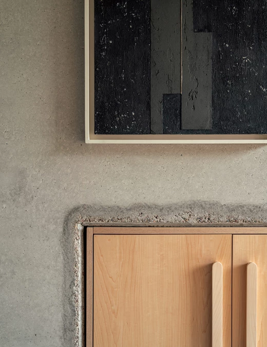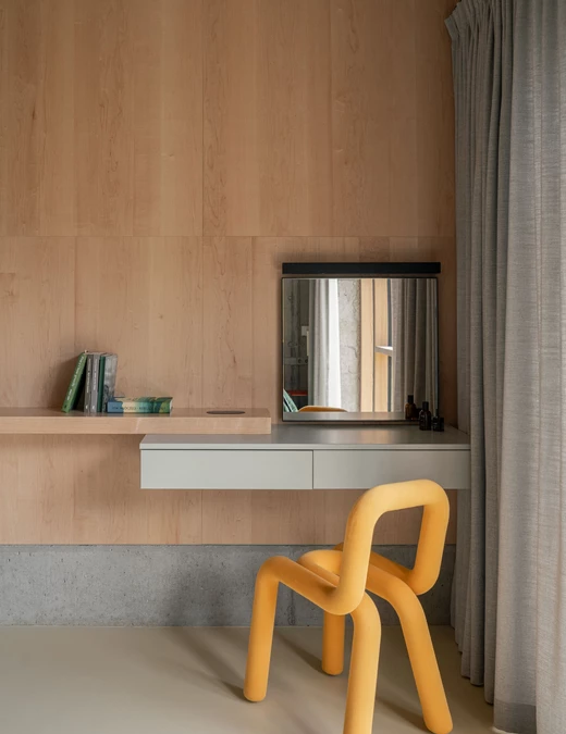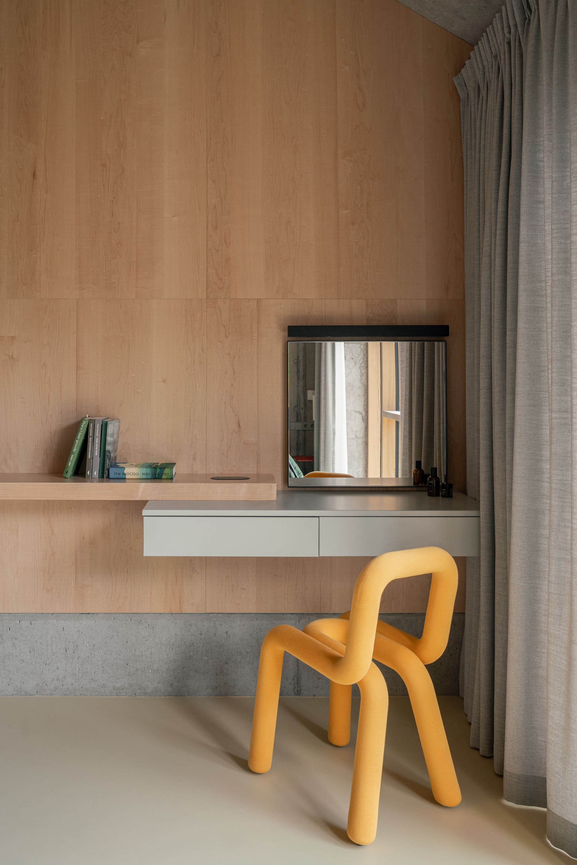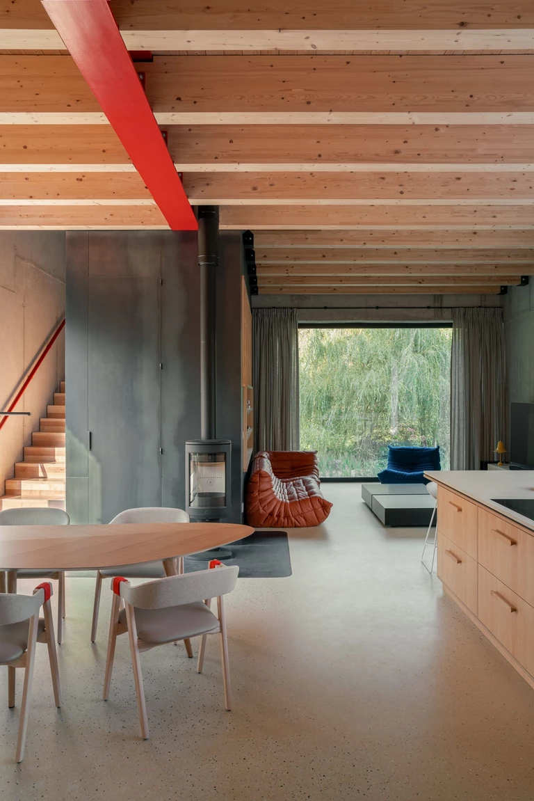 Wnętrza domu są utrzymane w ciepłej, naturalnej tonacji. Zaprojektowane na wymiar meble ze sklejki tworzą spójną całość z jasnożółtą posadzką, w której zatopiono czarne kamyki. Ten detal powstał na etapie wykonywania podłogi i symbolicznie odnosi się do torfowisk występujących w okolicy.