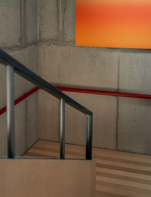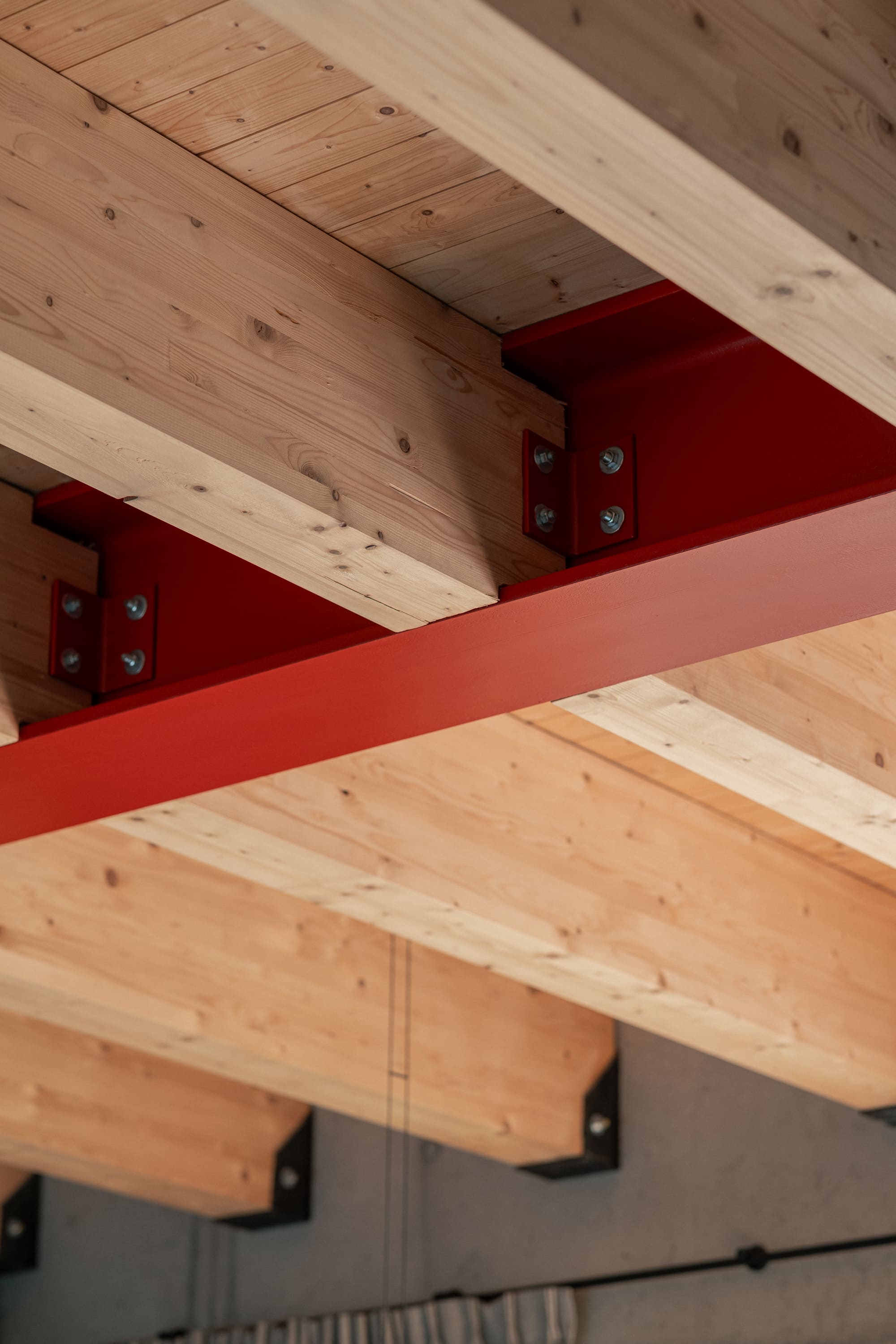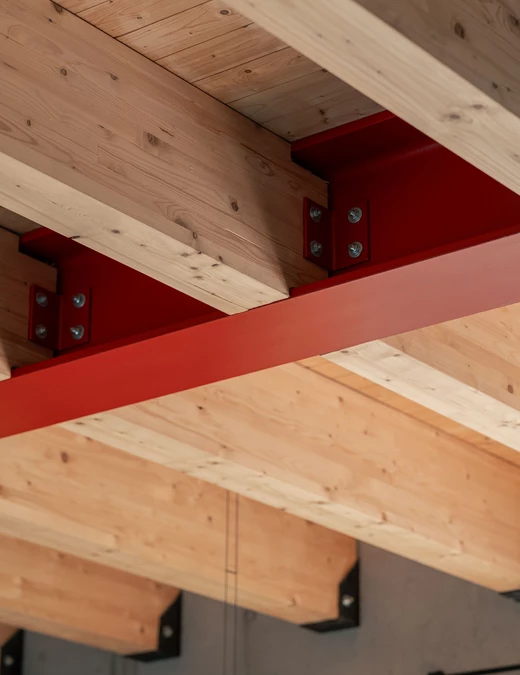 Budynek posadowiono na 10-metrowych palach, co wynikło z charakterystyki gruntu dawnego jeziora. Elewacja wykończona jest lokalną deską pochodzącą ze starej, rozebranej stodoły.