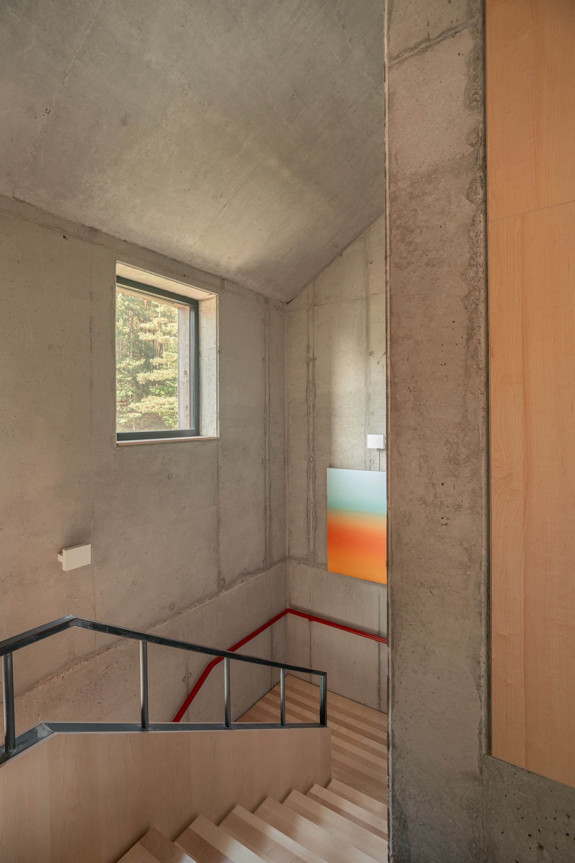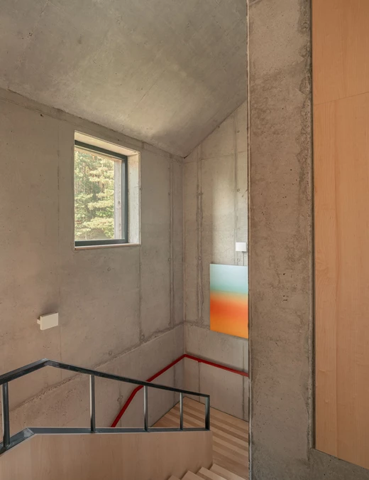 Budynek został usytuowany blisko drogi, aby maksymalnie zachować naturalny charakter działki. Mur oporowy, konieczny ze względu na różnicę poziomów, pełni dodatkowo funkcję akumulacyjną – gromadzi ciepło i wspomaga ogrzewanie budynku. Ukształtowanie bryły pozwoliło na stworzenie dwóch tarasów o odmiennym charakterze.