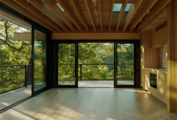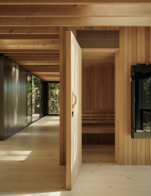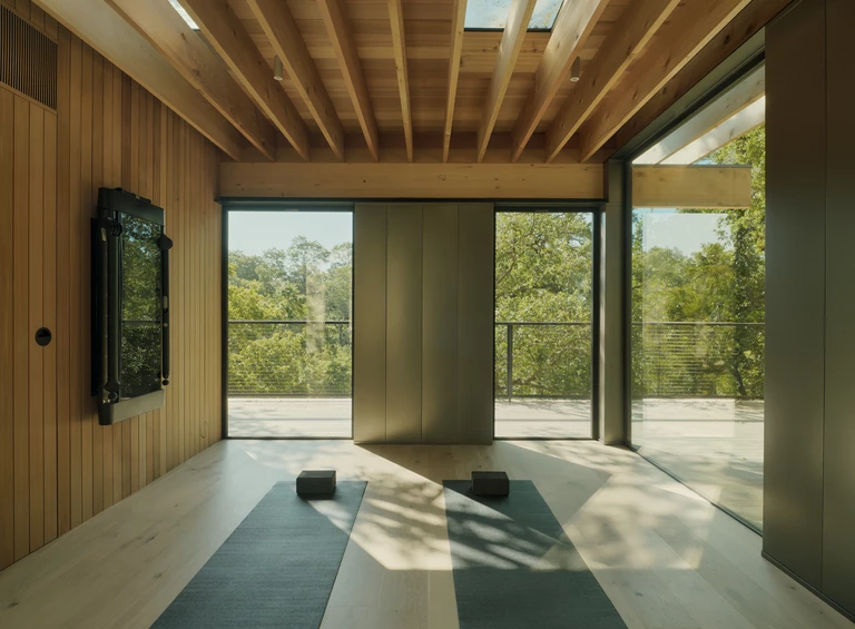 Zleceniodawcy marzyli o miejscu, które będzie sprzyjało medytacji, jodze i ćwiczeniom, a jednocześnie stanie się sceną dla letnich przyjęć. Architekci stworzyli więc pawilon wellness, który niemal dosłownie przeplata się z otaczającym drzewostanem, zachowując naturalny układ dębów i sekwoi.