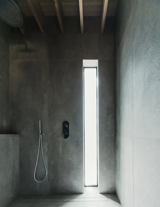 Smukłe kolumny unoszą budynek ponad spadkiem terenu, łącząc go z istniejącym domem z lat 70. na poziomie jego przyziemia.