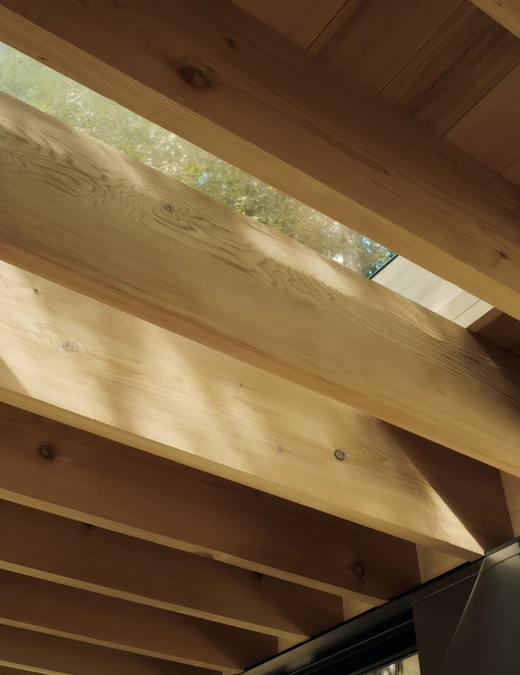 Wnętrze pawilonu zorganizowano wokół centralnego, cedrowego rdzenia, mieszczącego saunę i łazienkę. Z każdej strony otaczają go przesuwne szklane drzwi, dzięki którym granica między wnętrzem a naturą niemal zanika. Sufit z odsłoniętej więźby cedrowej, w którym jest aż dziewięć świetlików, przepuszcza rozproszone światło – podobne do tego przenikającego przez korony drzew.