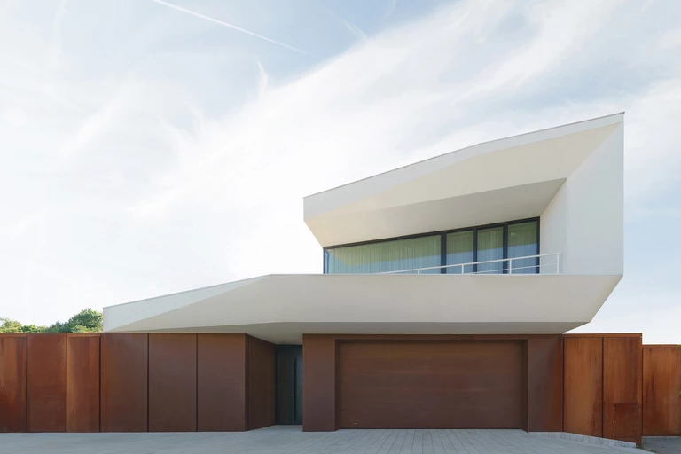 Elewacja i dach domu zostały pokryte cortenem – stalą węglową, która szybko rdzewieje. Rdza to jednocześnie warstwa dekoracyjna i ochronna. Dalsza korozja jest samoograniczona, warstwa powstałej już patyny nie dopuszcza do jej pogłębiania.