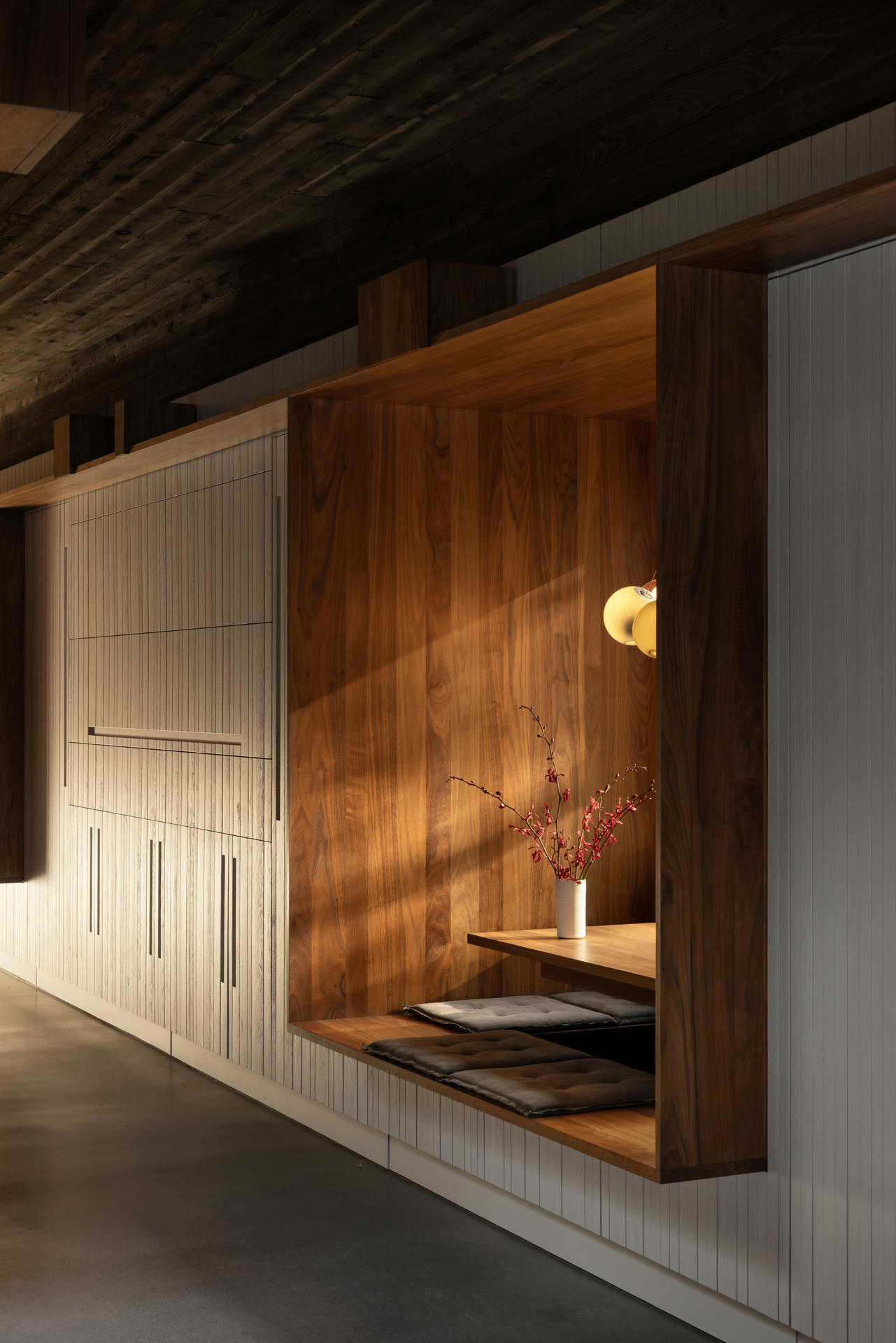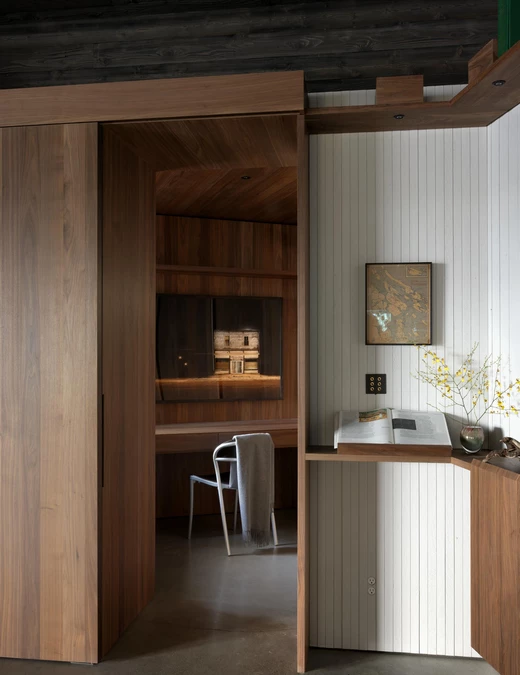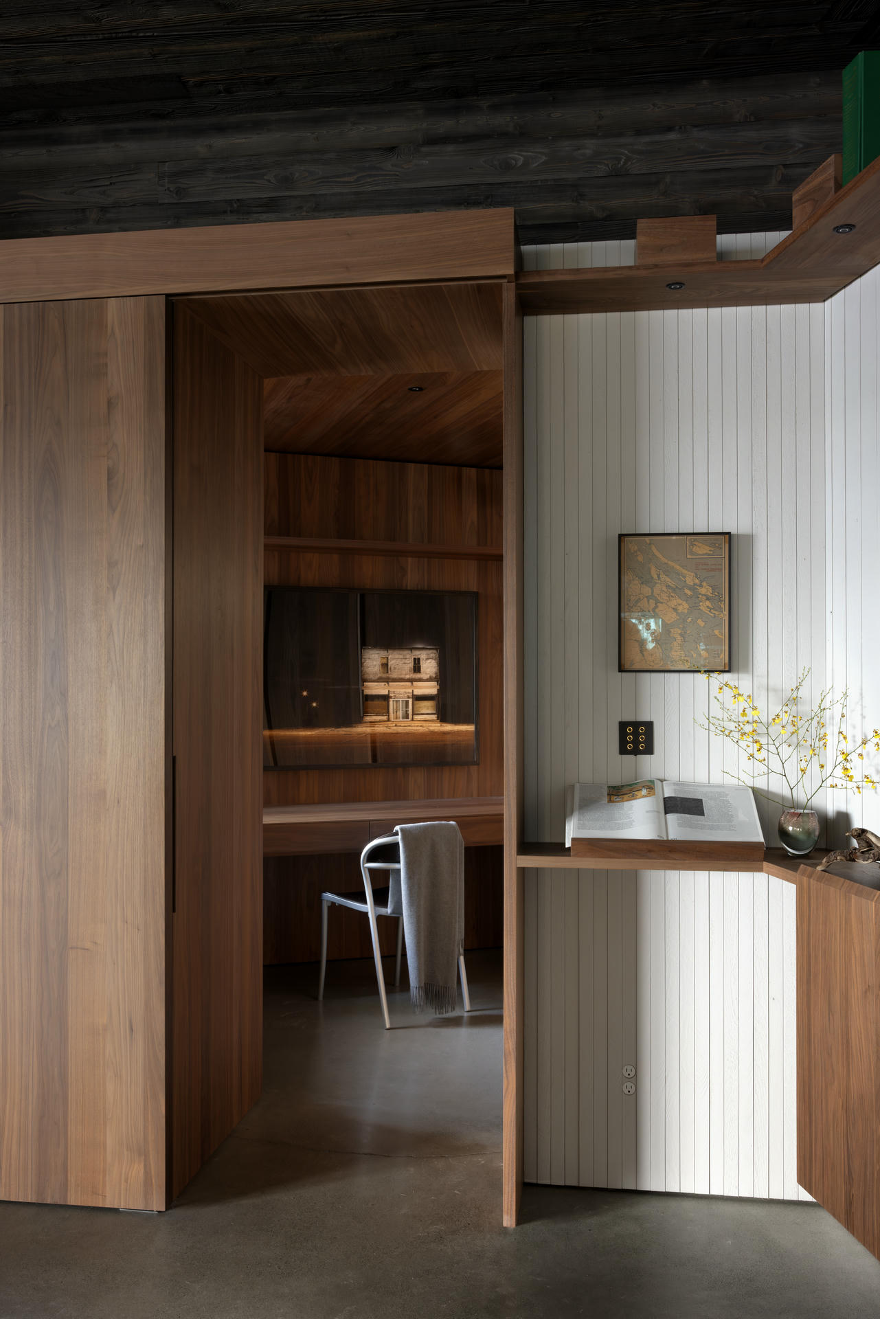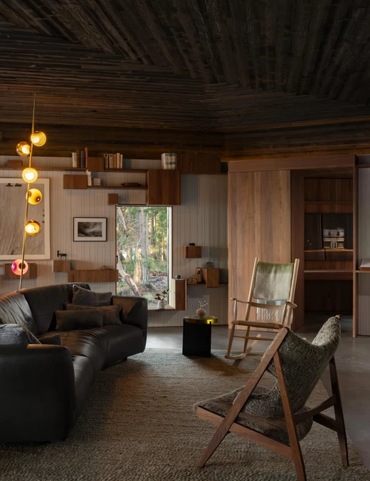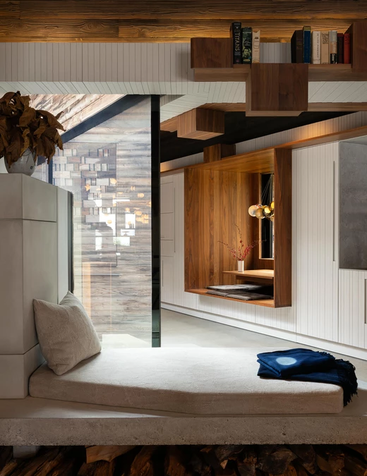 W kwestii użytych materiałów dom wyraźnie nawiązuje do otaczającego go krajobrazu. Elewacje wykonano z masywnych bloków cedru, poddanych intensywnemu piaskowaniu. Proces ten uwypukla strukturę słojów drewna, co nadało drewnu niemal geologiczną ekspresję.