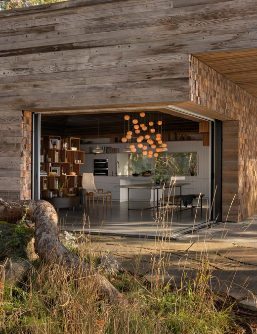Sekwencja przestrzenna kończy się ponownym zetknięciem z ziemią, ale tym razem po zachodniej stronie działki – na plaży otwierającej się wprost na Ocean Spokojny. Droga przez dom prowadzi więc od gęstego lasu, przez przestrzeń zawieszoną wysoko nad terenem, aż po szeroki, otwarty horyzont oceanu.