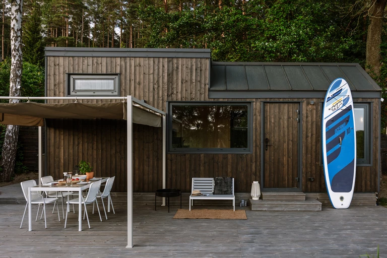 Wystarczy podpiąć go do samochodu jak przyczepę kempingową i bez problemu można zmienić miejsce oraz widoki. Ale póki co, dobrze mu tam, gdzie jest, bo Mini Lake House zdążył już zapuścić korzenie w Rentynach, małej wypoczynkowej wsi na Warmii położonej tuż przy jeziorze Giłwa.