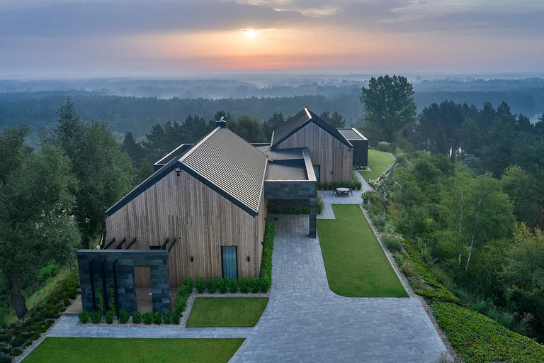Różan to mała miejscowość na Mazowszu położona na prawym brzegu Narwi. Tutejszy malowniczy krajobraz zanurzony jest w naturze, ciszy i spokoju. W tej fascynującej przyrodniczo okolicy stanął dom zaprojektowany przez architektkę Jagnę Bielowicką. Działka znajduje się na cyplu otoczonym stromymi wąwozami. Dzięki takiej lokalizacji właściciel domu ma niczym nieograniczony widok na bezkresny las i wijącą się tuż obok Narew.