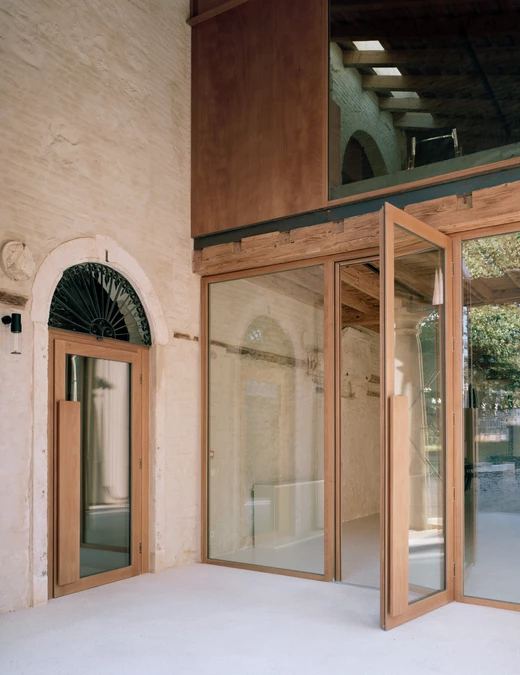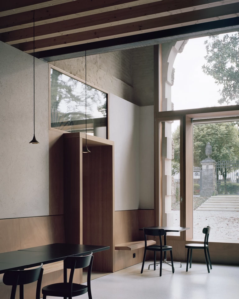 Sercem zrewitalizowanego kompleksu stała się kawiarnia i restauracja, zlokalizowana w dwukondygnacyjnej części budynku gospodarczego. Najwyraźniej tu widać zamysł projektantów – odsłonięte, szorstkie tekstury oryginalnego muru kontrastują z precyzyjnie wykonaną zabudową z jasnego drewna. Wszystkie elementy wyposażenia, od lady barowej po ławy, zostały zaprojektowane na wymiar, tworząc spójną całość z architektoniczną ramą budynku. Uwagę zwraca środkowy łuk fasady, w którym projektanci zawiesili drewnianą bryłę pełniącą funkcję wizualnego łącznika między wnętrzem a publicznym ogrodem.