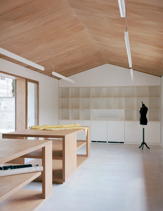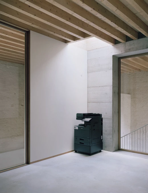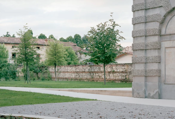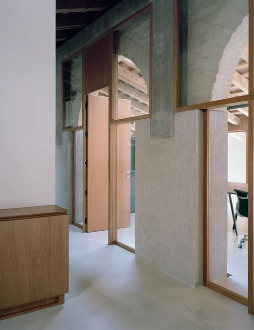 Komunikację między poziomami zapewnia nowa klatka schodowa, ukryta w dawnym domu dozorcy. Wykonana jest z betonu, z trepami z szarego kamienia z Vicenzy. Stalowa poręcz odcina się od surowych ścian pokrytych cienką warstwą wapiennego tynku, który nie ukrywa, lecz podkreśla fakturę dawnych murów. Projekt budynku dopełnia starannie zaprojektowane otoczenie – miejski ogród i tradycyjny sad owocowy, które służyć będą lokalnej społeczności.