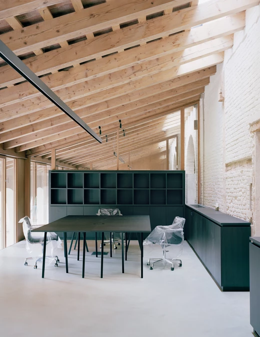 Co istotne, nowa konstrukcja została odsunięta od kamiennej kolumnady, co pozwoliło na zachowanie czytelności historycznego układu i rozwiązanie dawnych problemów konstrukcyjnych. Nad salą, na piętrze, urządzili nowoczesne przestrzenie do pracy wspólnej oraz biura, gdzie nowoczesne przegrody współgrają z dawną więźbą dachową.