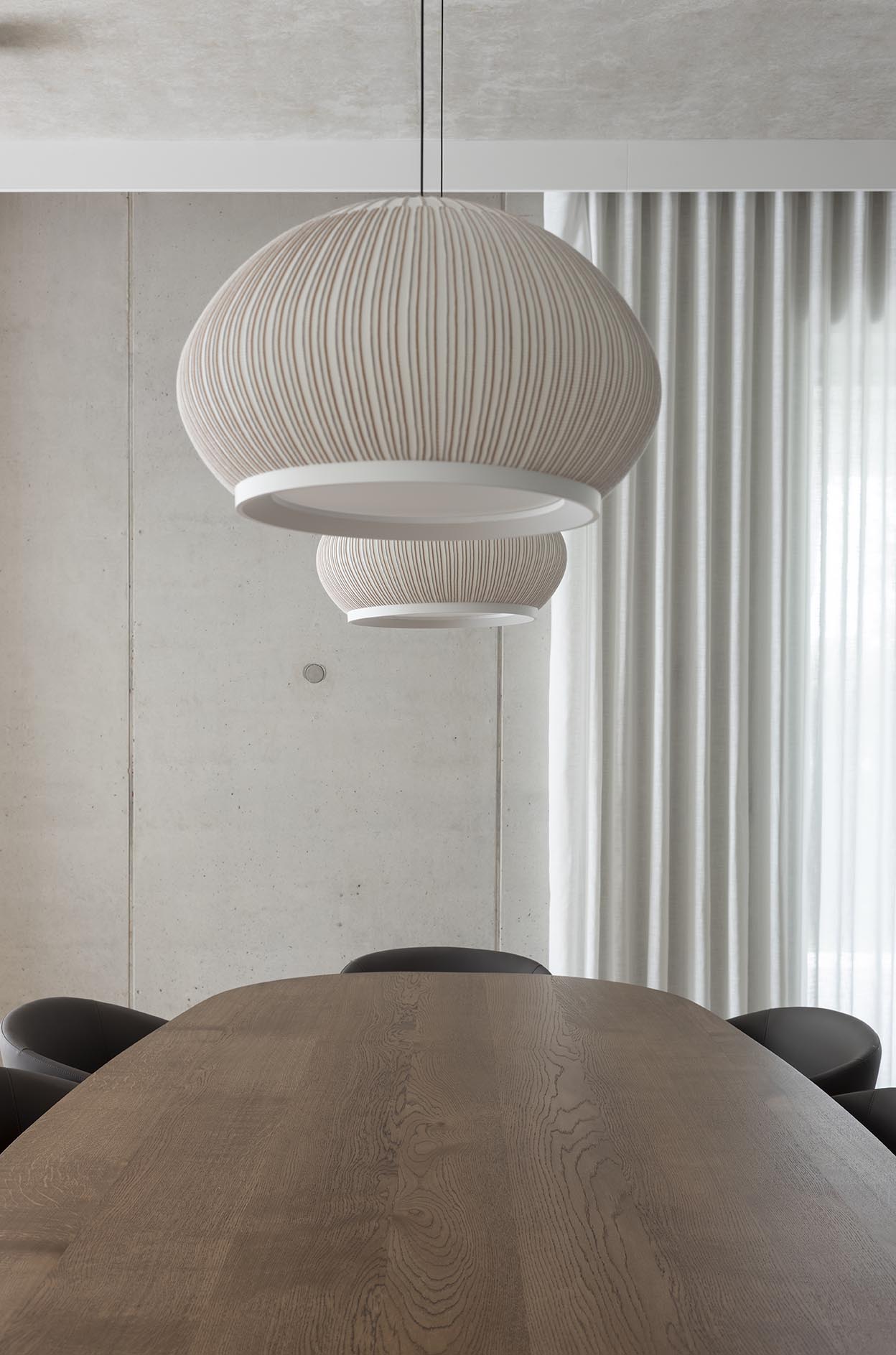 Lokalizacja domu sprzyja przyglądania się bryle z wielu różnych perspektyw. Wszystkie zaplanowane rozwiązania przestrzenne, podkreślają dialog między otwartą formą od strony ogrodu a bardziej zamkniętym i monolitycznym charakterem od strony drogi. Wysunięte zadaszenia, wsporniki i zróżnicowana faktura elewacji nadają budynkowi dynamiki, a przy tym minimalizują odbicie światła, aby chronić miejscową faunę.