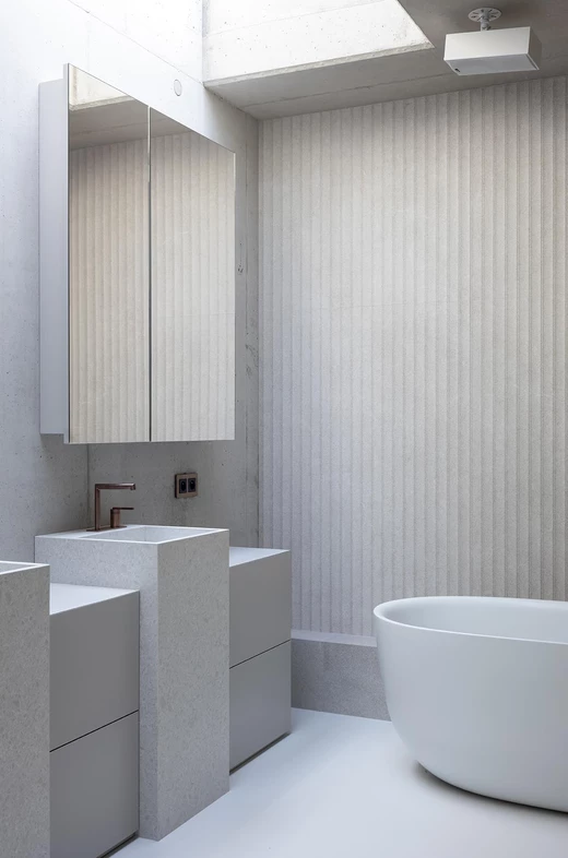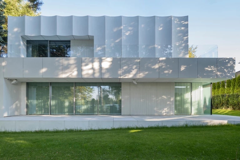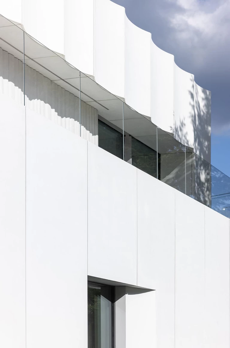 Beton jest podstawowym materiałem, na którym bazuje projekt. Z białego cementu ukształtowane zostały także trójwymiarowe, zbrojone włóknem szklanym płyty GRC, pokrywające fasady budynku od cokołu aż po dach. W projekcie domu nie przewidziano obróbki blacharskiej, gzymsów, okapów, parapetów czy elementów zewnętrznych z innych materiałów niż beton. Jedyny wyjątek stanowi szkło w oknach i transparentna balustrada na piętrze.
