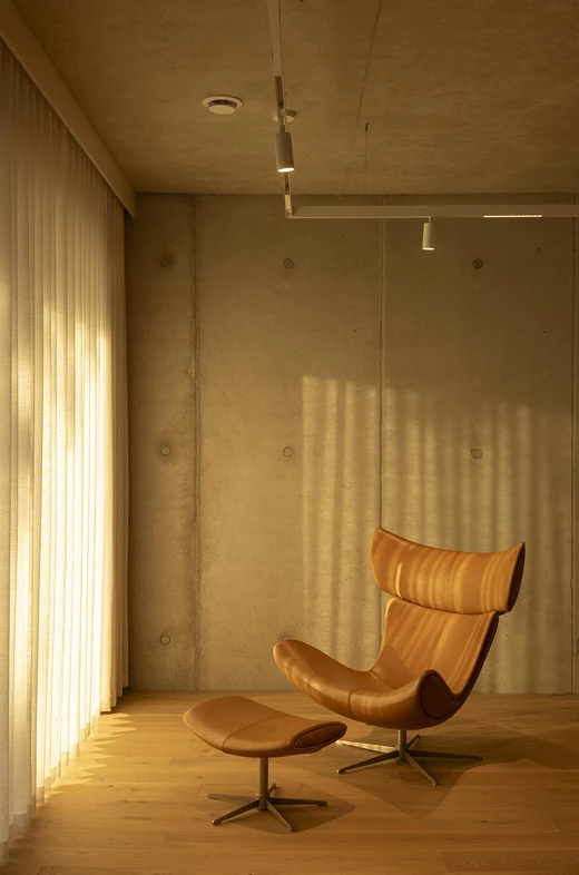 Charakterystyczny efekt soczewek lub łupinek w fasadzie pierwszego piętra budynku osiągnięto przez zastosowanie techniki „odejmowania dłutem” kolejnych warstw sześcianu. W ten sam sposób powstały zagłębione tarasy parteru, otwory okienne i precyzyjnie „wyfrezowane” betonowe detale fasady.