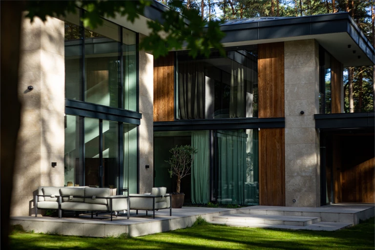 Projekt budynku bazuje na prostych, geometrycznych formach oraz wyrazistych, stalowych dachach, które nadają bryle horyzontalnych proporcji. Zamiast dominować nad krajobrazem, dom subtelnie wtapia się w leśną przestrzeń. To zasługa naturalnych materiałów – głównie jesionowego drewna i kamienia. Duże przeszklenia zapewniają nie tylko wspaniałe widoki na las, ale także maksymalne wykorzystanie naturalnego światła, co pozwala ograniczyć zużycie energii.