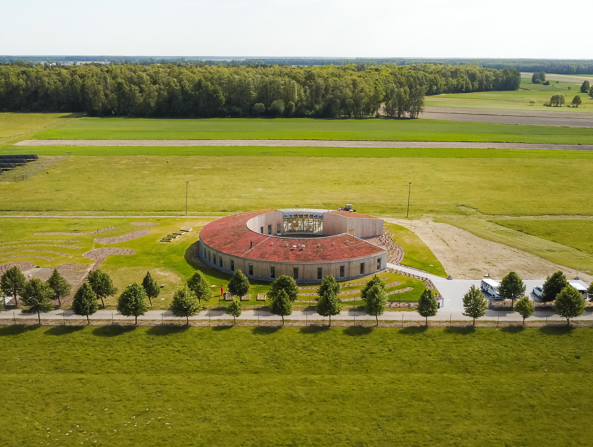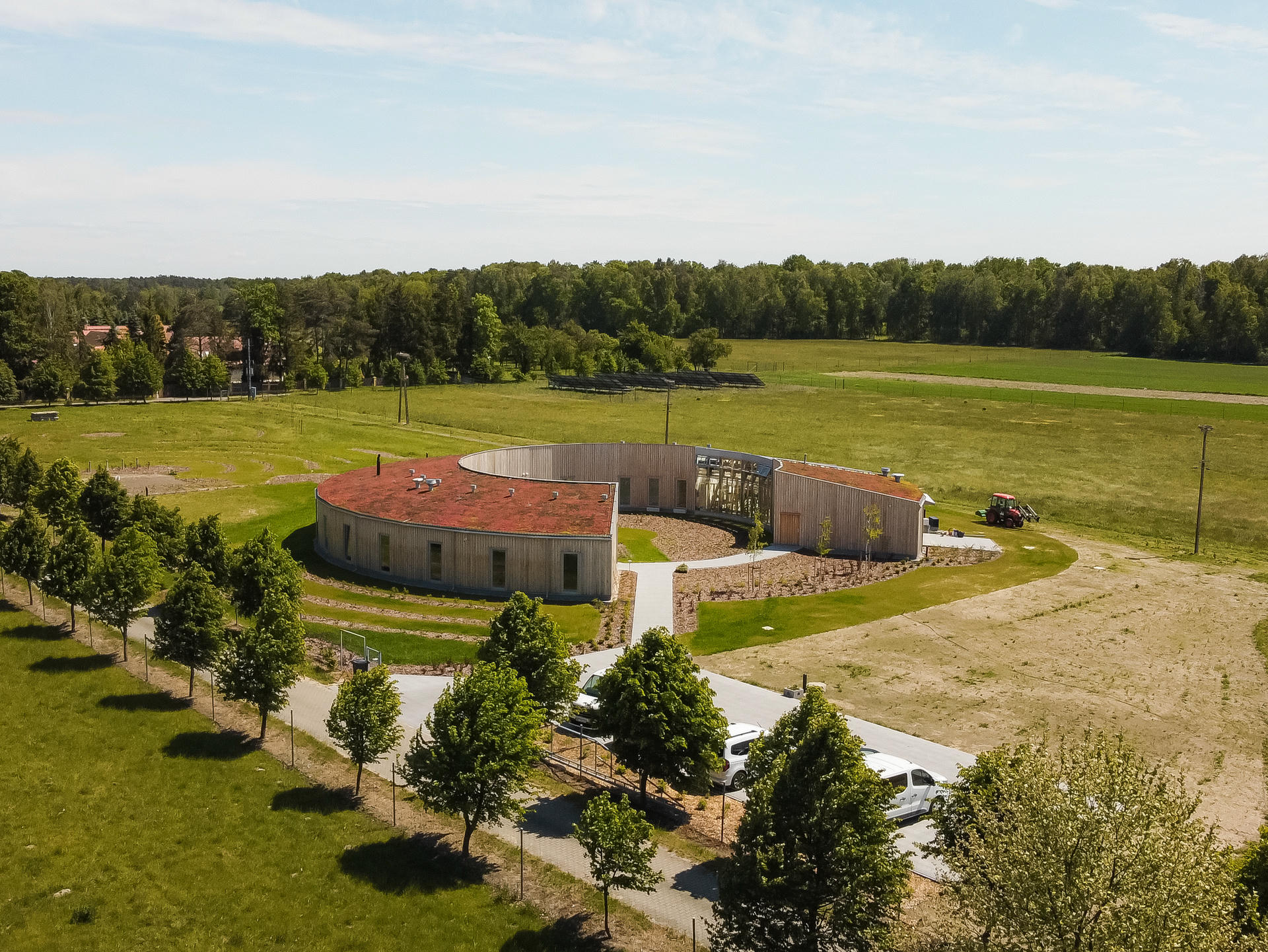 Architekci Piotr Grochowski, Wojciech Kolęda i Anna Skorupka stworzyli drewniany, jednokondygnacyjny obiekt o cyrkularnym układzie – forma ta nawiązuje do cykliczności natury i charakteru życia na wsi.