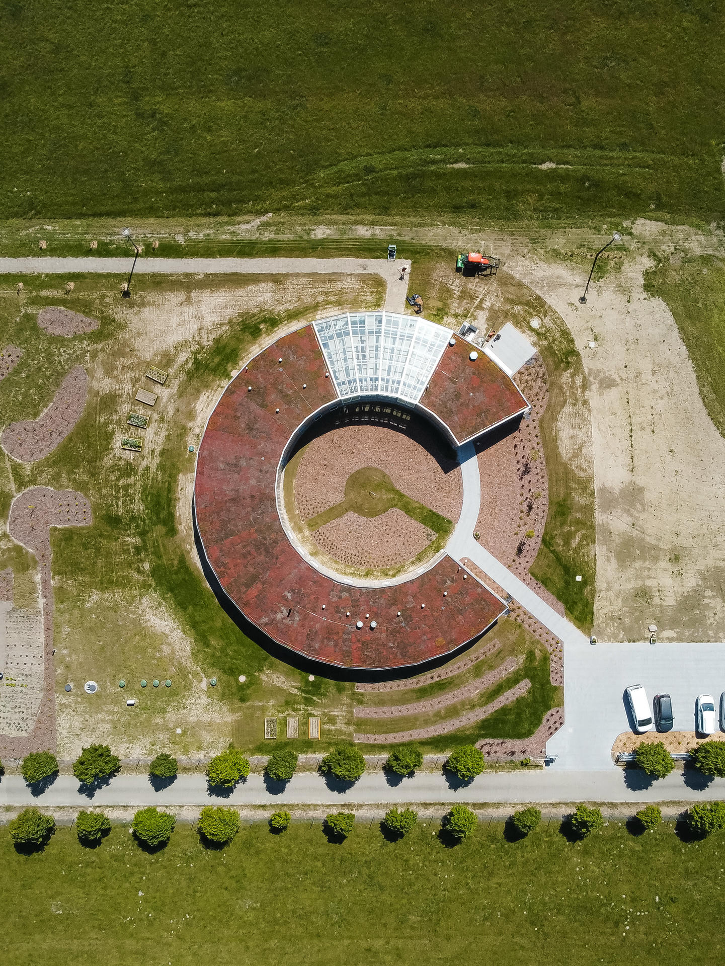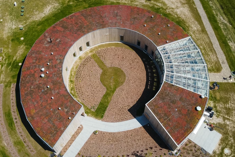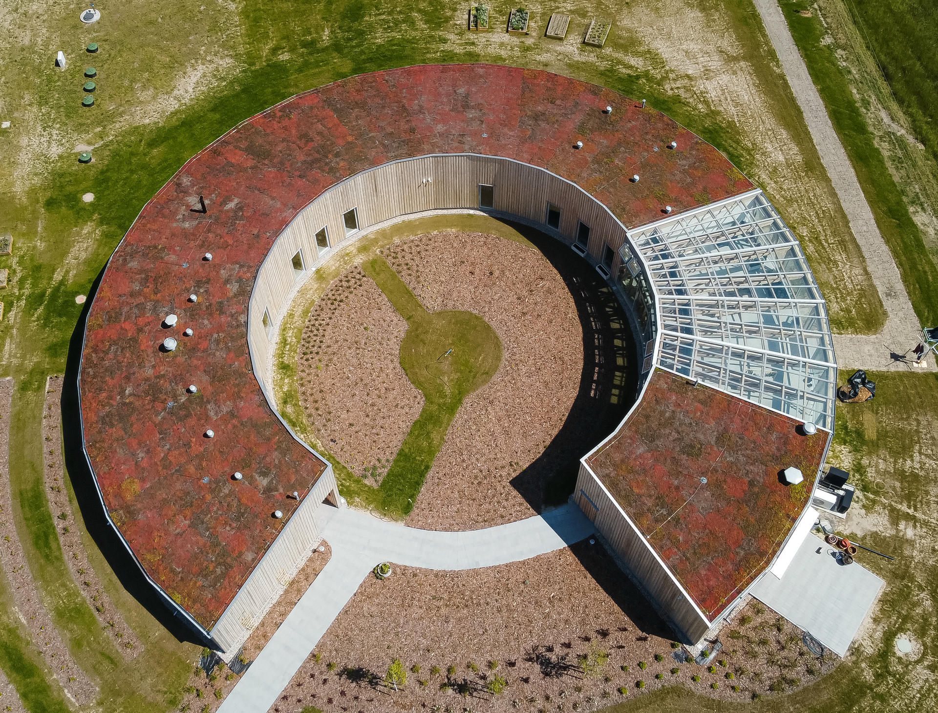 Parterowa struktura o średnicy około 40 metrów skupia wszystkie funkcje wokół dziedzińca. To właśnie on stał się sercem założenia: miejscem spotkań, pracy i budowania relacji – bez hierarchii i podziałów.