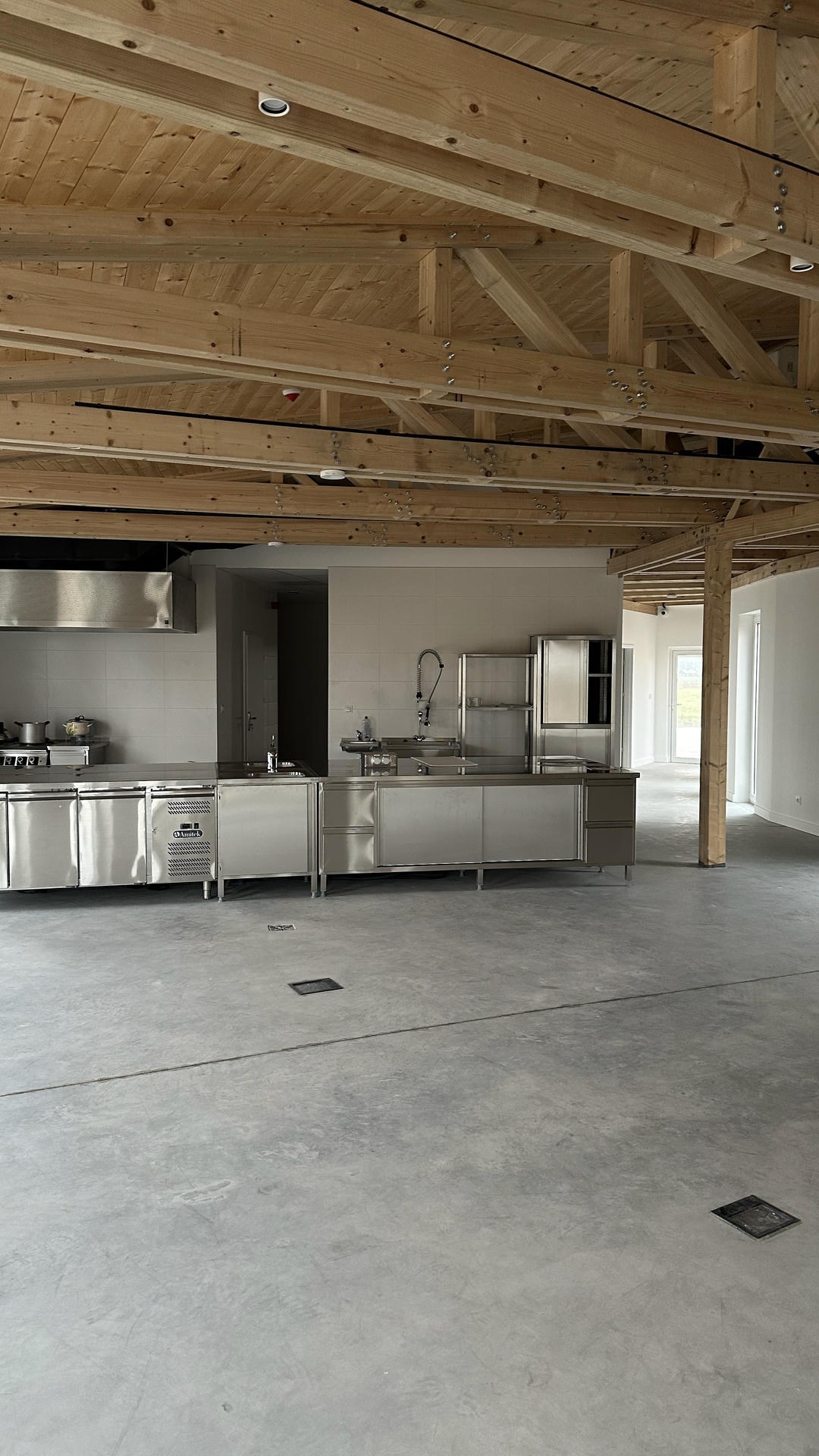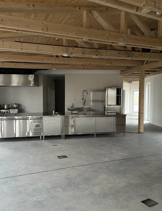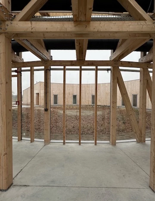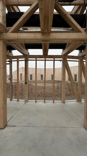 Konstrukcja farmy powstała z lokalnego drewna oraz prefabrykowanych elementów, co pozwoliło skrócić czas realizacji i zredukować ślad środowiskowy inwestycji. Całość uzupełniają rozwiązania sprzyjające samowystarczalności – zielony dach, panele fotowoltaiczne, system retencji wody deszczowej oraz pompa ciepła – konsekwentnie realizujące zasadę 4R: reduce, reuse, recycle, rethink.