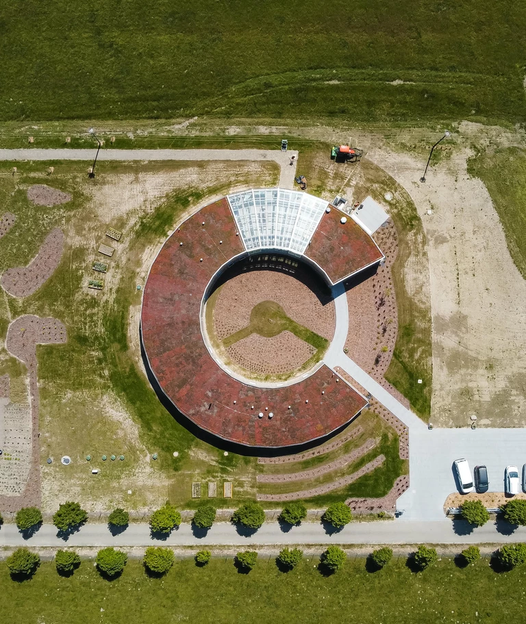 Lokalizacja na obszarze pozbawionym wyraźnych odniesień architektonicznych stała się dla architektów punktem wyjścia i skłoniła do poszukiwania inspiracji w samej naturze. Stonowana paleta barw, roślinność na dachu oraz powtarzalny rytm elewacji sprawiają, że obiekt wtapia się w krajobraz.