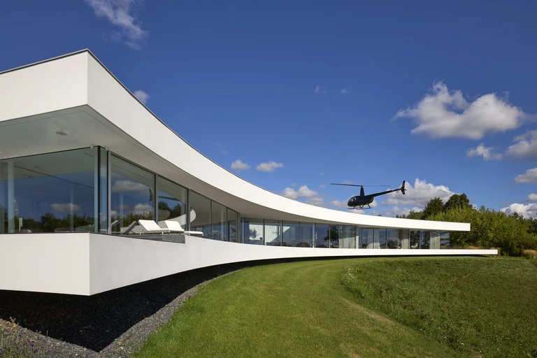Architekt podjął decyzję o wpisaniu budynku w spadek terenu, kreśląc jego linię wzdłuż rzeki. Dzięki temu zabiegowi dom jest niemal niezauważalny od strony drogi dojazdowej. Futurystycznego stylu projektowi dodają kubistyczne formy i ostre linie, dzięki którym do ukształtowanych w ten sposób mniejszych form i pomieszczeń dociera naturalne światło. Łuk bryły zyskał kilkusetmetrowy, zadaszony na całej długości taras, który otwiera dom na rozległy krajobraz. Zbalansowana przestrzeń to również efekt użytych materiałów. Białe tynki i kamienne spieki kwarcowe nadają budynkowi ponadczasowy charakter.